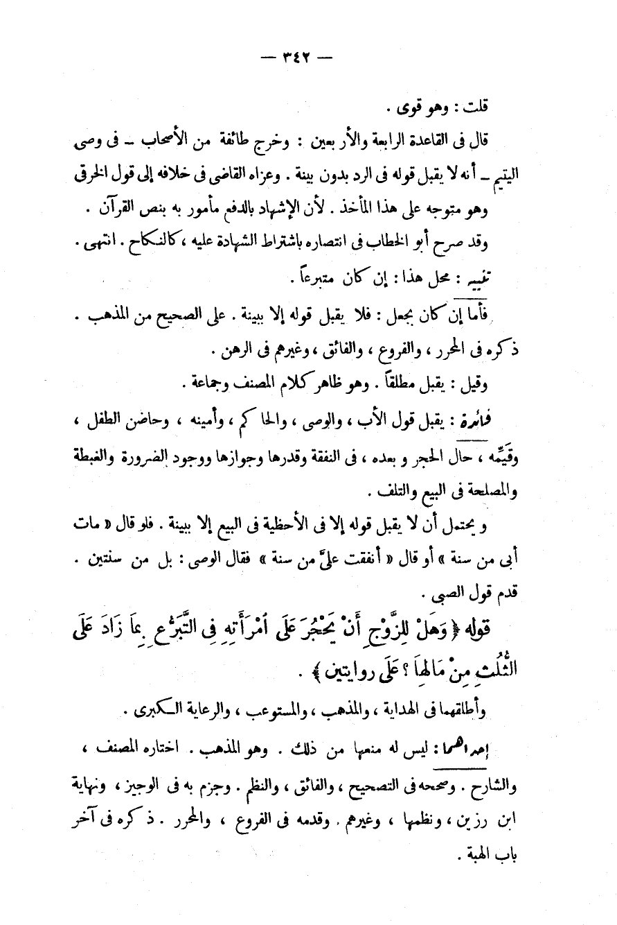 قُلْت: وَهُوَ قَوِيٌّ. قَالَ فِي الْقَاعِدَةِ الرَّابِعَةِ وَالْأَرْبَعِينَ: وَخَرَجَ طَائِفَةٌ مِنْ الْأَصْحَابِ فِي وَصِيِّ الْيَتِيمِ أَنَّهُ لَا يُقْبَلُ قَوْلُهُ فِي الرَّدِّ بِدُونِ بَيِّنَةٍ. وَعَزَاهُ الْقَاضِي فِي خِلَافِهِ إلَى قَوْلِ الْخِرَقِيِّ وَهُوَ مُتَوَجِّهٌ عَلَى هَذَا الْمَأْخَذِ؛ لِأَنَّ الْإِشْهَادَ بِالدَّفْعِ مَأْمُورٌ بِهِ بِنَصِّ الْقُرْآنِ. وَقَدْ صَرَّحَ أَبُو الْخَطَّابِ فِي انْتِصَارِهِ بِاشْتِرَاطِ الشَّهَادَةِ عَلَيْهِ كَالنِّكَاحِ. انْتَهَى.
