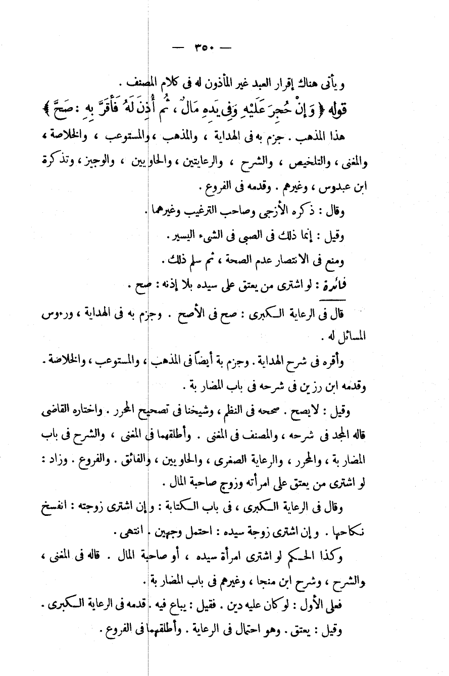 لَوْ اشْتَرَى مَنْ يُعْتَقُ عَلَى سَيِّدِهِ بِلَا إذْنِهِ: صَحَّ. قَالَ فِي الرِّعَايَةِ الْكُبْرَى: صَحَّ فِي الْأَصَحِّ. وَجَزَمَ بِهِ فِي الْهِدَايَةِ، وَرُءُوسِ الْمَسَائِلِ لَهُ. وَأَقَرَّهُ فِي شَرْحِ الْهِدَايَةِ. وَجَزَمَ بِهِ أَيْضًا فِي الْمُذْهَبِ، وَالْمُسْتَوْعِبِ، وَالْخُلَاصَةِ. وَقَدَّمَهُ ابْنُ رَزِينٍ فِي شَرْحِهِ فِي بَابِ الْمُضَارَبَةِ. وَقِيلَ: لَا يَصِحُّ. صَحَّحَهُ فِي النَّظْمِ، وَشَيْخُنَا فِي تَصْحِيحِ الْمُحَرَّرِ. وَاخْتَارَهُ الْقَاضِي قَالَ الْمَجْدُ فِي شَرْحِهِ، وَالْمُصَنِّفُ فِي الْمُغْنِي. وَأَطْلَقَهُمَا فِي الْمُغْنِي، وَالشَّرْحِ فِي بَابِ الْمُضَارَبَةِ، وَالْمُحَرَّرِ، وَالرِّعَايَةِ الصُّغْرَى، وَالْحَاوِيَيْنِ، وَالْفَائِقِ. وَالْفُرُوعِ. وَزَادَ: لَوْ اشْتَرَى مَنْ يُعْتَقُ عَلَى امْرَأَتِهِ وَزَوْجِ صَاحِبَةِ الْمَالِ. وَقَالَ فِي الرِّعَايَةِ الْكُبْرَى، فِي بَابِ الْكِتَابَةِ: وَإِنْ اشْتَرَى زَوْجَتَهُ: انْفَسَخَ نِكَاحُهَا. وَإِنْ اشْتَرَى زَوْجَةَ سَيِّدِهِ: احْتَمَلَ وَجْهَيْنِ. انْتَهَى.