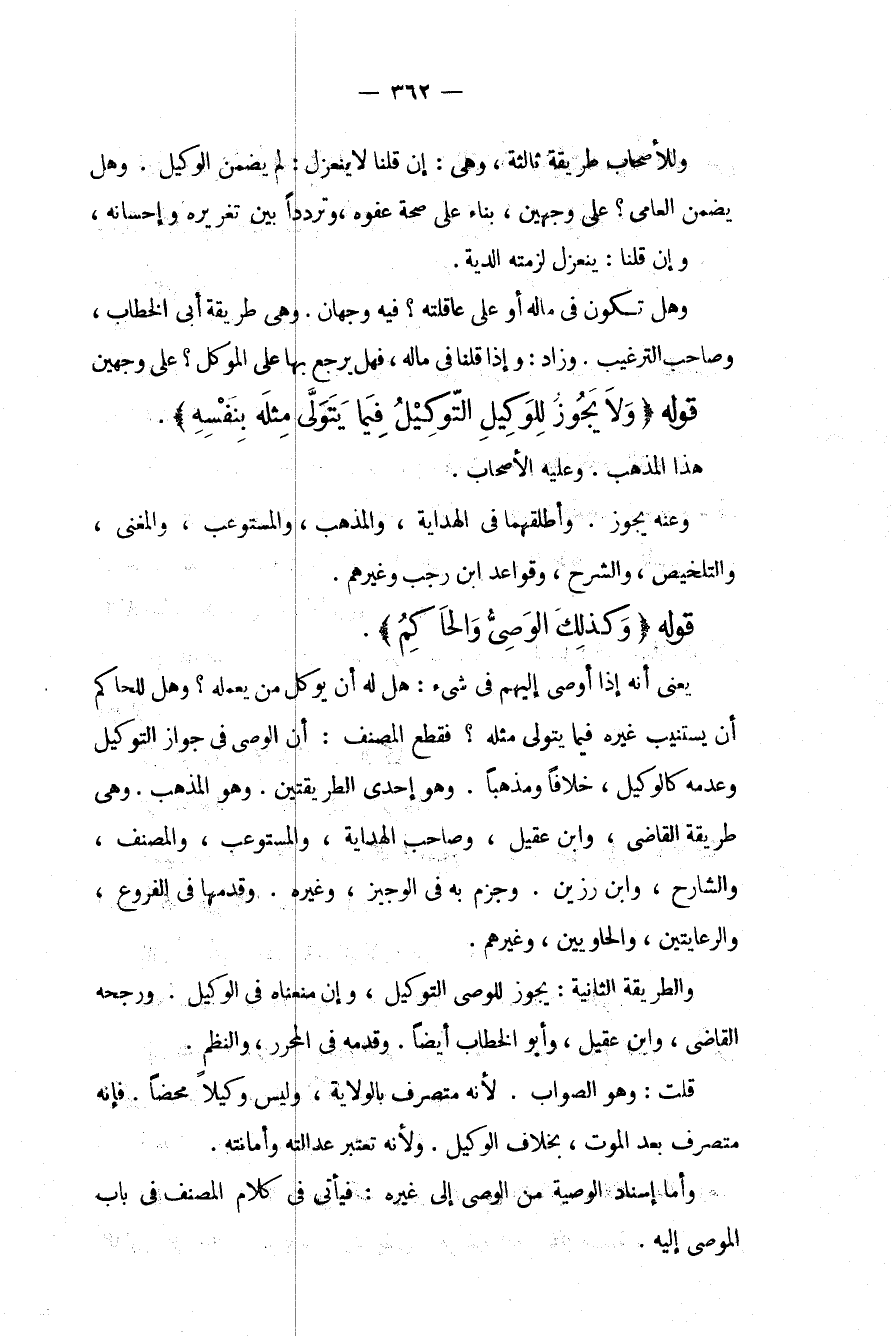 قَوْلُهُ (وَلَا يَجُوزُ لِلْوَكِيلِ التَّوْكِيلُ فِيمَا يَتَوَلَّى مِثْلَهُ بِنَفْسِهِ) . هَذَا الْمَذْهَبُ. وَعَلَيْهِ الْأَصْحَابُ. وَعَنْهُ يَجُوزُ. وَأَطْلَقَهُمَا فِي الْهِدَايَةِ، وَالْمُذْهَبِ، وَالْمُسْتَوْعِبِ، وَالْمُغْنِي، وَالتَّلْخِيصِ، وَالشَّرْحِ، وَقَوَاعِدِ ابْنِ رَجَبٍ وَغَيْرُهُمْ. قَوْلُهُ (وَكَذَلِكَ الْوَصِيُّ وَالْحَاكِمُ) . يَعْنِي أَنَّهُ إذَا أَوْصَى إلَيْهِمْ فِي شَيْءٍ: هَلْ لَهُ أَنْ يُوَكِّلَ مَنْ يَعْمَلُهُ وَهَلْ لِلْحَاكِمِ أَنْ يَسْتَنِيبَ غَيْرَهُ فِيمَا يَتَوَلَّى مِثْلَهُ فَقَطَعَ الْمُصَنِّفُ: أَنَّ الْوَصِيَّ فِي جَوَازِ التَّوْكِيلِ وَعَدَمِهِ كَالْوَكِيلِ، خِلَافًا وَمَذْهَبًا. وَهُوَ إحْدَى الطَّرِيقَتَيْنِ. وَهُوَ الْمَذْهَبُ. وَهِيَ طَرِيقَةُ الْقَاضِي، وَابْنِ عَقِيلٍ، وَصَاحِبِ الْهِدَايَةِ، وَالْمُسْتَوْعِبِ، وَالْمُصَنِّفِ، وَالشَّارِحِ، وَابْنِ رَزِينٍ. وَجَزَمَ بِهِ فِي الْوَجِيزِ، وَغَيْرِهِ. وَقَدَّمَهَا فِي الْفُرُوعِ، وَالرِّعَايَتَيْنِ، وَالْحَاوِيَيْنِ، وَغَيْرِهِمْ، وَالطَّرِيقَةُ الثَّانِيَةُ: يَجُوزُ لِلْوَصِيِّ التَّوْكِيلُ، وَإِنْ مَنَعْنَاهُ فِي الْوَكِيلِ. وَرَجَّحَهُ الْقَاضِي، وَابْنُ عَقِيلٍ، وَأَبُو الْخَطَّابِ أَيْضًا. وَقَدَّمَهُ فِي الْمُحَرَّرِ، وَالنَّظْمِ. قُلْت: وَهُوَ الصَّوَابُ؛ لِأَنَّهُ مُتَصَرِّفٌ بِالْوِلَايَةِ، وَلَيْسَ تَوْكِيلًا مَحْضًا. فَإِنَّهُ مُتَصَرِّفٌ بَعْدَ الْمَوْتِ، بِخِلَافِ الْوَكِيلِ؛ وَلِأَنَّهُ تُعْتَبَرُ عَدَالَتُهُ وَأَمَانَتُهُ. وَأَمَّا إسْنَادُ الْوَصِيَّةِ مِنْ الْوَصِيِّ إلَى غَيْرِهِ: فَيَأْتِي فِي كَلَامِ الْمُصَنِّفِ فِي بَابِ الْمُوصَى إلَيْهِ.