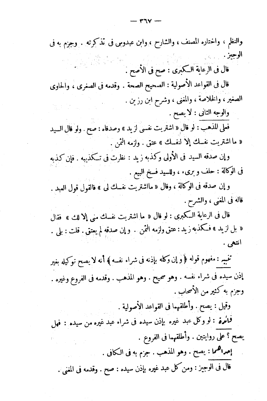 وَالنَّظْمِ، وَاخْتَارَهُ الْمُصَنِّفُ، وَالشَّارِحُ، وَابْنُ عَبْدُوسٍ فِي تَذْكِرَتِهِ. وَجَزَمَ بِهِ فِي الْوَجِيزِ. قَالَ فِي الرِّعَايَةِ الْكُبْرَى: صَحَّ فِي الْأَصَحِّ. قَالَ فِي الْقَوَاعِدِ الْأُصُولِيَّةِ: الصَّحِيحُ الصِّحَّةُ. وَقَدَّمَهُ فِي الصُّغْرَى، وَالْحَاوِي الصَّغِيرِ، وَالْخُلَاصَةِ، وَالْمُغْنِي، وَشَرْحِ ابْنِ رَزِينٍ، وَالْوَجْهُ الثَّانِي: لَا يَصِحُّ. فَعَلَى الْمَذْهَبِ: لَوْ قَالَ " اشْتَرَيْت نَفْسِي لِزَيْدٍ " وَصَدَّقَاهُ: صَحَّ. وَلَوْ قَالَ السَّيِّدُ " مَا اشْتَرَيْت نَفْسَك إلَّا لِنَفْسِك " عَتَقَ. وَلَزِمَهُ الثَّمَنُ. وَإِنْ صَدَّقَهُ السَّيِّدُ فِي الْأُولَى وَكَذَّبَهُ زَيْدٌ: نَظَرْت فِي تَكْذِيبِهِ. فَإِنْ كَذَّبَهُ فِي الْوَكَالَةِ: حَلَفَ وَبَرِئَ، وَلِلسَّيِّدِ فَسْخُ الْبَيْعِ. وَإِنْ صَدَّقَهُ فِي الْوَكَالَةِ، وَقَالَ " مَا اشْتَرَيْت نَفْسَك لِي " فَالْقَوْلُ قَوْلُ الْعَبْدِ. قَالَهُ فِي الْمُغْنِي، وَالشَّرْحِ. قَالَ فِي الرِّعَايَةِ الْكُبْرَى: لَوْ قَالَ " مَا اشْتَرَيْت نَفْسَك مِنِّي إلَّا لَك " فَقَالَ " بَلْ لِزَيْدٍ " فَكَذَّبَهُ زَيْدٌ: عَتَقَ وَلَزِمَهُ الثَّمَنُ. وَإِنْ صَدَّقَهُ لَمْ يَعْتِقْ. قُلْت: بَلَى انْتَهَى.