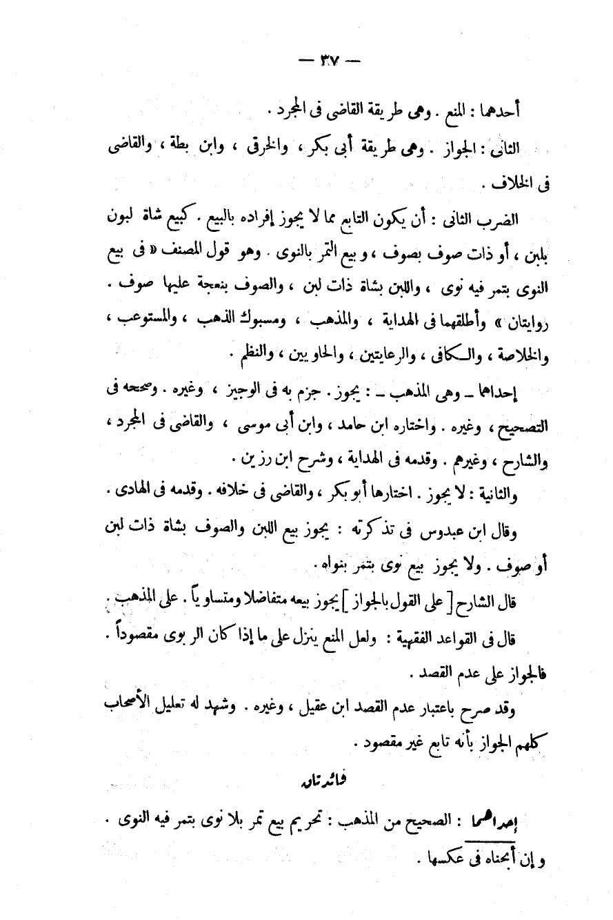 وَالثَّانِيَةُ: لَا يَجُوزُ. اخْتَارَهَا أَبُو بَكْرٍ، وَالْقَاضِي فِي خِلَافِهِ. وَقَدَّمَهُ فِي الْهَادِي. وَقَالَ ابْنُ عَبْدُوسٍ فِي تَذْكِرَتِهِ: يَجُوزُ بَيْعُ اللَّبَنِ وَالصُّوفِ بِشَاةٍ ذَاتِ لَبَنٍ أَوْ صُوفٍ. وَلَا يَجُوزُ بَيْعُ نَوًى بِتَمْرٍ بِنَوَاهُ. قَالَ الشَّارِحُ [عَلَى الْقَوْلِ بِالْجَوَازِ] يَجُوزُ بَيْعُهُ مُتَفَاضِلًا وَمُتَسَاوِيًا. عَلَى الْمَذْهَبِ قَالَ فِي الْقَوَاعِدِ الْفِقْهِيَّةِ: وَلَعَلَّ الْمَنْعَ يَنْزِلُ عَلَى مَا إذَا كَانَ الرِّبَوِيُّ مَقْصُودًا. فَالْجَوَازُ عَلَى عَدَمِ الْقَصْدِ. وَقَدْ صَرَّحَ بِاعْتِبَارِ عَدَمِ الْقَصْدِ ابْنُ عَقِيلٍ وَغَيْرُهُ. وَشَهِدَ لَهُ تَعْلِيلُ الْأَصْحَابِ كُلِّهِمْ الْجَوَازَ بِأَنَّهُ تَابِعٌ غَيْرُ مَقْصُودٍ.