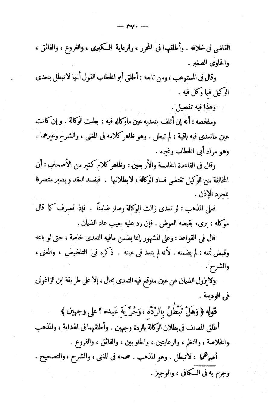 الْقَاضِي فِي خِلَافِهِ. وَأَطْلَقَهُمَا فِي الْمُحَرَّرِ، وَالرِّعَايَةِ الْكُبْرَى، وَالْفُرُوعِ، وَالْفَائِقِ، وَالْحَاوِي الصَّغِيرِ. وَقَالَ فِي الْمُسْتَوْعِبِ، وَمَنْ تَابَعَهُ: أَطْلَقَ أَبُو الْخَطَّابِ الْقَوْلَ أَنَّهَا لَا تَبْطُلُ بِتَعَدِّي الْوَكِيلِ فِيمَا وُكِّلَ فِيهِ. وَهَذَا فِيهِ تَفْصِيلٌ. وَمُلَخَّصُهُ: أَنَّهُ إنْ أُتْلِفَ بِتَعَدِّيهِ عَيْنَ مَا وَكَّلَهُ فِيهِ: بَطَلَتْ الْوَكَالَةُ. وَإِنْ كَانَتْ عَيْنَ مَا تَعَدَّى فِيهِ بَاقِيَةٌ: لَمْ تَبْطُلْ. وَهُوَ ظَاهِرُ كَلَامِهِ فِي الْمُغْنِي، وَالشَّرْحِ وَغَيْرِهِمَا. وَهُوَ مُرَادُ أَبِي الْخَطَّابِ وَغَيْرِهِ. وَقَالَ فِي الْقَاعِدَةِ الْخَامِسَةِ وَالْأَرْبَعِينَ: وَظَاهِرُ كَلَامِ كَثِيرٍ مِنْ الْأَصْحَابِ: أَنَّ الْمُخَالَفَةَ مِنْ الْوَكِيلِ تَقْتَضِي فَسَادَ الْوَكَالَةِ، لَا بُطْلَانَهَا. فَيَفْسُدُ الْعَقْدُ وَيَصِيرُ مُتَصَرِّفًا بِمُجَرَّدِ الْإِذْنِ. فَعَلَى الْمَذْهَبِ: لَوْ تَعَدَّى زَالَتْ الْوَكَالَةُ وَصَارَ ضَامِنًا. فَإِذْ تَصَرَّفَ كَمَا قَالَ مُوَكِّلُهُ: بَرِئَ بِقَبْضِهِ الْعِوَضَ. فَإِنْ رُدَّ عَلَيْهِ بِعَيْبٍ عَادَ الضَّمَانُ. قَالَ فِي الْقَوَاعِدِ: وَعَلَى الْمَشْهُورِ إنَّمَا يَضْمَنُ مَا فِيهِ التَّعَدِّي خَاصَّةً، حَتَّى لَوْ بَاعَهُ وَقَبَضَ ثَمَنَهُ: لَمْ يَضْمَنْهُ؛ لِأَنَّهُ لَمْ يَتَعَدَّ فِي عَيْنِهِ.