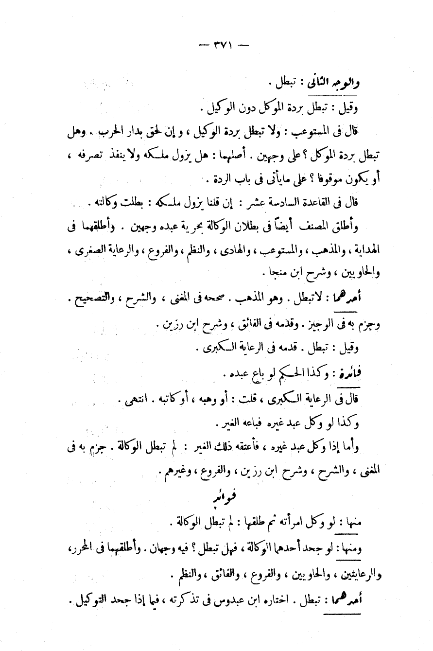 وَالْوَجْهُ الثَّانِي: تَبْطُلُ. وَقِيلَ: تَبْطُلُ بِرِدَّةِ الْمُوَكِّلِ دُونَ الْوَكِيلِ. قَالَ فِي الْمُسْتَوْعِبِ: وَلَا تَبْطُلُ بِرِدَّةِ الْوَكِيلِ، وَإِنْ لَحِقَ بِدَارِ الْحَرْبِ وَهَلْ تَبْطُلُ بِرِدَّةِ الْمُوَكِّلِ؟ عَلَى وَجْهَيْنِ. أَصْلُهُمَا: هَلْ يَزُولُ مِلْكُهُ وَلَا يَنْفُذُ تَصَرُّفُهُ، أَوْ يَكُونُ مَوْقُوفًا؟ عَلَى مَا يَأْتِي فِي بَابِ الرِّدَّةِ. قَالَ فِي الْقَاعِدَةِ السَّادِسَةَ عَشْرَةَ: إنْ قُلْنَا يَزُولُ مِلْكُهُ: بَطَلَتْ وَكَالَتُهُ. وَأَطْلَقَ الْمُصَنِّفُ أَيْضًا فِي بُطْلَانِ الْوَكَالَةِ بِحُرِّيَّةِ عَبْدِهِ وَجْهَيْنِ. وَأَطْلَقَهُمَا فِي الْهِدَايَةِ، وَالْمُذْهَبِ، وَالْمُسْتَوْعِبِ، وَالْهَادِي، وَالنَّظْمِ، وَالرِّعَايَةِ الصُّغْرَى، وَالْحَاوِيَيْنِ، وَشَرْحِ ابْنِ مُنَجَّى.