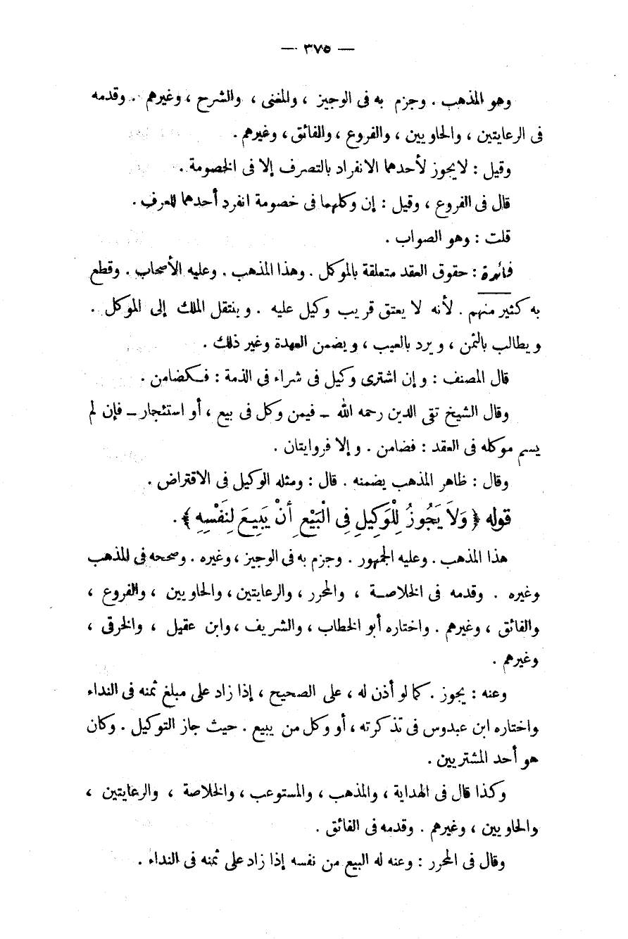 حُقُوقُ الْعَقْدِ مُتَعَلِّقَةٌ بِالْمُوَكِّلِ. وَهَذَا الْمَذْهَبُ. وَعَلَيْهِ الْأَصْحَابُ. وَقَطَعَ بِهِ كَثِيرٌ مِنْهُمْ؛ لِأَنَّهُ لَا يُعْتَقُ قَرِيبُ وَكِيلٍ عَلَيْهِ. وَيَنْتَقِلُ الْمِلْكُ إلَى الْمُوَكِّلِ. وَيُطَالَبُ بِالثَّمَنِ، وَيُرَدُّ بِالْعَيْبِ، وَيَضْمَنُ الْعُهْدَةَ وَغَيْرَ ذَلِكَ. قَالَ الْمُصَنِّفُ: وَإِنْ اشْتَرَى وَكِيلٌ فِي شِرَاءٍ فِي الذِّمَّةِ: فَكَضَامِنٍ. وَقَالَ الشَّيْخُ تَقِيُّ الدِّينِ - رَحِمَهُ اللَّهُ - فِيمَنْ وُكِّلَ فِي بَيْعٍ، أَوْ اسْتِئْجَارٍ فَإِنْ لَمْ يُسَمِّ مُوَكِّلَهُ فِي الْعَقْدِ: فَضَامِنٌ. وَإِلَّا فَرِوَايَتَانِ. وَقَالَ: ظَاهِرُ الْمَذْهَبِ يَضْمَنُهُ. قَالَ: وَمِثْلُهُ الْوَكِيلُ فِي الِاقْتِرَاضِ.