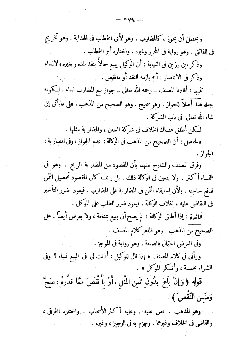 أَفَادَنَا الْمُصَنِّفُ - رَحِمَهُ اللَّهُ تَعَالَى - جَوَازَ بَيْعِ الْمُضَارِبِ نَسَاءً؛ لِكَوْنِهِ جَعَلَهُ هُنَا أَصْلًا لِلْجَوَازِ. وَهُوَ صَحِيحٌ. وَهُوَ الصَّحِيحُ مِنْ الْمَذْهَبِ. عَلَى مَا يَأْتِي إنْ شَاءَ اللَّهُ تَعَالَى فِي بَابِ الشَّرِكَةِ. لَكِنْ أَطْلَقَ هُنَاكَ الْخِلَافَ فِي شَرِكَةِ الْعَنَانِ، وَالْمُضَارَبَةُ مِثْلُهَا. فَالْحَاصِلُ: أَنَّ الصَّحِيحَ مِنْ الْمَذْهَبِ فِي الْوَكَالَةِ: عَدَمُ الْجَوَازِ، وَفِي الْمُضَارَبَةِ: الْجَوَازُ. وَفَرَّقَ الْمُصَنِّفُ وَالشَّارِحُ بَيْنَهُمَا بِأَنَّ الْمَقْصُودَ مِنْ الْمُضَارَبَةِ الرِّبْحُ. وَهُوَ فِي النَّسَاءِ أَكْثَرُ. وَلَا يَتَعَيَّنُ فِي الْوَكَالَةِ ذَلِكَ. بَلْ رُبَّمَا كَانَ الْمَقْصُودُ تَحْصِيلَ الثَّمَنِ لِدَفْعِ حَاجَتِهِ؛ وَلِأَنَّ اسْتِيفَاءَ الثَّمَنِ فِي الْمُضَارَبَةِ عَلَى الْمُضَارِبِ. فَيَعُودُ ضَرَرُ التَّأْخِيرِ فِي التَّقَاضِي عَلَيْهِ، بِخِلَافِ الْوَكَالَةِ. فَيَعُودُ ضَرَرُ الطَّلَبِ عَلَى الْمُوَكِّلِ.