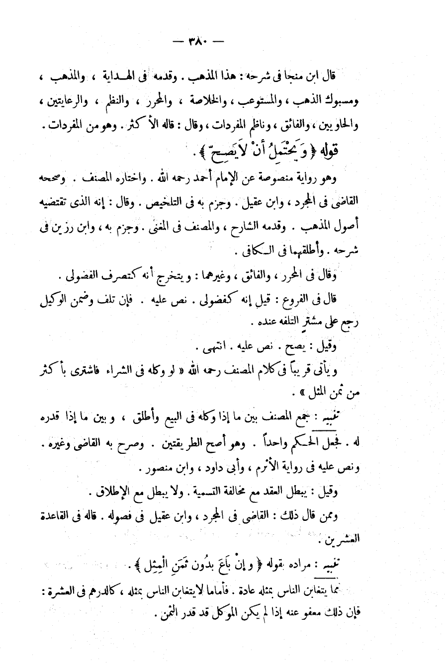 قَالَ ابْنُ مُنَجَّى فِي شَرْحِهِ: هَذَا الْمَذْهَبُ. وَقَدَّمَهُ فِي الْهِدَايَةِ، وَالْمُذْهَبِ، وَمَسْبُوكِ الذَّهَبِ، وَالْمُسْتَوْعِبِ، وَالْخُلَاصَةِ، وَالْمُحَرَّرِ، وَالنَّظْمِ، وَالرِّعَايَتَيْنِ، وَالْحَاوِيَيْنِ، وَالْفَائِقِ، وَنَاظِمِ الْمُفْرَدَاتِ، وَقَالَ: قَالَهُ الْأَكْثَرُ. وَهُوَ مِنْ الْمُفْرَدَاتِ. قَوْلُهُ (وَيُحْتَمَلُ أَنْ لَا يَصِحَّ) . وَهُوَ رِوَايَةٌ مَنْصُوصَةٌ عَنْ الْإِمَامِ أَحْمَدَ - رَحِمَهُ اللَّهُ -. وَاخْتَارَهُ الْمُصَنِّفُ. وَصَحَّحَهُ الْقَاضِي فِي الْمُجَرَّدِ، وَابْنُ عَقِيلٍ. وَجَزَمَ بِهِ فِي التَّلْخِيصِ. قَالَ: إنَّهُ الَّذِي تَقْتَضِيهِ أُصُولُ الْمَذْهَبِ. وَقَدَّمَهُ الشَّارِحُ، وَالْمُصَنِّفُ فِي الْمُغْنِي. وَجَزَمَ بِهِ، وَابْنُ رَزِينٍ فِي شَرْحِهِ. وَأَطْلَقَهُمَا فِي الْكَافِي. وَقَالَ فِي الْمُحَرَّرِ، وَالْفَائِقِ، وَغَيْرِهِمَا: وَيَتَخَرَّجُ أَنَّهُ كَتَصَرُّفِ الْفُضُولِيِّ. قَالَ فِي الْفُرُوعِ: قِيلَ إنَّهُ كَفُضُولِيٍّ. نَصَّ عَلَيْهِ. فَإِنْ تَلِفَ وَضَمِنَ الْوَكِيلُ رَجَعَ عَلَى مُشْتَرٍ لِتَلَفِهِ عِنْدَهُ. وَقِيلَ: يَصِحُّ. نَصَّ عَلَيْهِ. انْتَهَى.