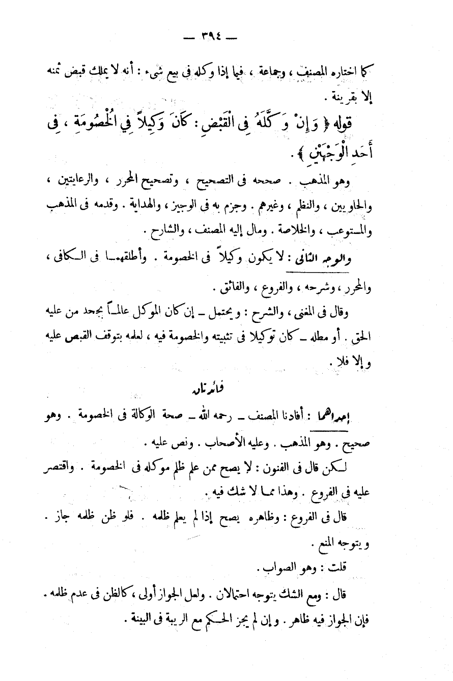 إحْدَاهُمَا: أَفَادَنَا الْمُصَنِّفُ - رَحِمَهُ اللَّهُ - صِحَّةَ الْوَكَالَةِ فِي الْخُصُومَةِ. وَهُوَ صَحِيحٌ. وَهُوَ الْمَذْهَبُ. وَعَلَيْهِ الْأَصْحَابُ. وَنَصَّ عَلَيْهِ. لَكِنْ قَالَ فِي الْفُنُونِ: لَا يَصِحُّ مِمَّنْ عَلِمَ ظُلْمَ مُوَكِّلِهِ فِي الْخُصُومَةِ. وَاقْتَصَرَ عَلَيْهِ فِي الْفُرُوعِ. وَهَذَا مِمَّا لَا شَكَّ فِيهِ. قَالَ فِي الْفُرُوعِ: وَظَاهِرُهُ يَصِحُّ إذَا لَمْ يَعْلَمْ ظُلْمَهُ. فَلَوْ ظَنَّ ظُلْمَهُ جَازَ. وَيَتَوَجَّهُ الْمَنْعُ. قُلْت: وَهُوَ الصَّوَابُ. قَالَ: وَمَعَ الشَّكِّ يَتَوَجَّهُ احْتِمَالَانِ. وَلَعَلَّ الْجَوَازَ أَوْلَى كَالظَّنِّ فِي عَدَمِ ظُلْمِهِ. فَإِنَّ الْجَوَازَ فِيهِ ظَاهِرٌ. وَإِنْ لَمْ يَجُزْ الْحُكْمُ مَعَ الرِّيبَةِ فِي الْبَيِّنَةِ.