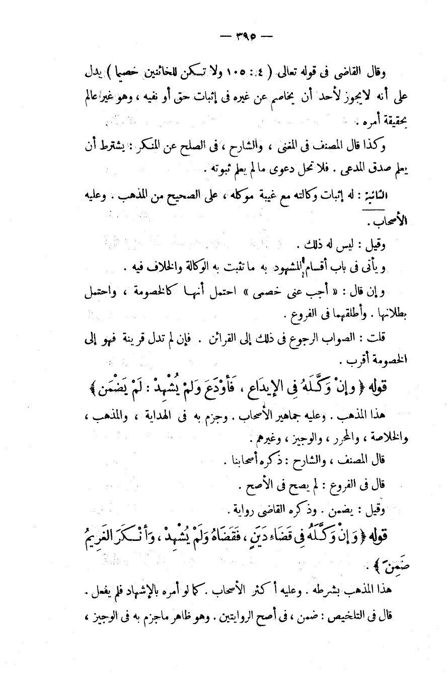 وَقَالَ الْقَاضِيَ فِي قَوْله تَعَالَى {وَلا تَكُنْ لِلْخَائِنِينَ خَصِيمًا} [النساء: 105] يَدُلُّ عَلَى أَنَّهُ لَا يَجُوزُ لِأَحَدٍ أَنْ يُخَاصِمَ عَنْ غَيْرِهِ فِي إثْبَاتِ حَقٍّ أَوْ نَفْيِهِ، وَهُوَ غَيْرُ عَالِمٍ بِحَقِيقَةِ أَمْرِهِ. وَكَذَا قَالَ الْمُصَنِّفُ فِي الْمُغْنِي، وَالشَّارِحُ، فِي الصُّلْحِ عَنْ الْمُنْكَرِ: يُشْتَرَطُ أَنْ يَعْلَمَ صِدْقَ الْمُدَّعِي. فَلَا تَحِلُّ دَعْوَى مَا لَمْ يُعْلَمْ ثُبُوتُهُ.