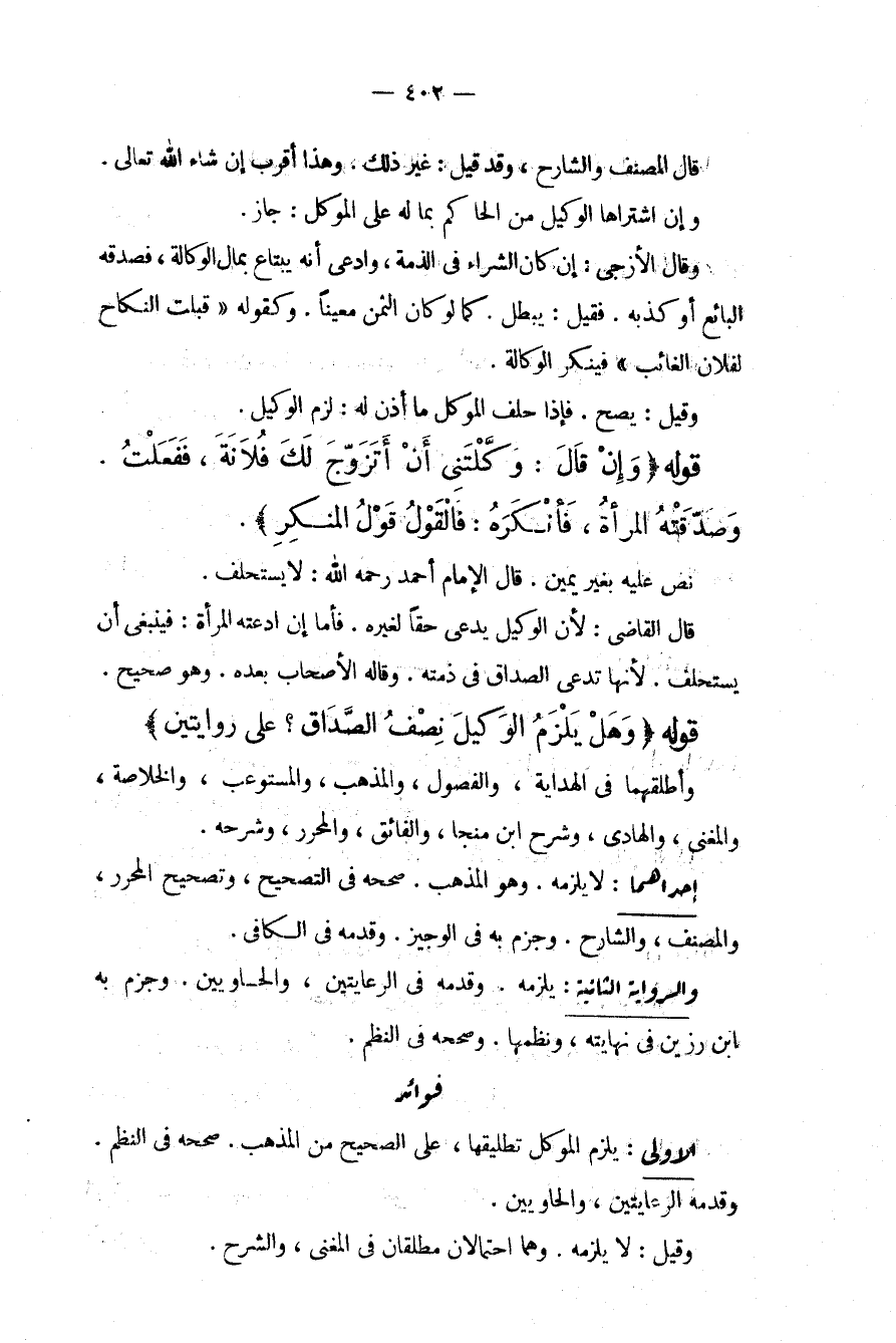 قَالَ الْمُصَنِّفُ وَالشَّارِحُ، وَقَدْ قِيلَ: غَيْرُ ذَلِكَ. وَهَذَا أَقْرَبُ إنْ شَاءَ اللَّهُ تَعَالَى. وَإِنْ اشْتَرَاهَا الْوَكِيلُ مِنْ الْحَاكِمِ بِمَا لَهُ عَلَى الْمُوَكِّلِ: جَازَ. وَقَالَ الْأَزَجِيُّ: إنْ كَانَ الشِّرَاءُ فِي الذِّمَّةِ، وَادَّعَى أَنَّهُ يَبْتَاعُ بِمَالِ الْوَكَالَةِ، فَصَدَّقَهُ الْبَائِعُ أَوْ كَذَّبَهُ. فَقِيلَ: يَبْطُلُ. كَمَا لَوْ كَانَ الثَّمَنُ مُعَيَّنًا. وَكَقَوْلِهِ " قَبِلْت النِّكَاحَ لِفُلَانٍ الْغَائِبِ " فَيُنْكِرُ الْوَكَالَةَ. وَقِيلَ: يَصِحُّ. فَإِذَا حَلَفَ الْمُوَكِّلُ مَا أَذِنَ لَهُ: لَزِمَ الْوَكِيلَ.
