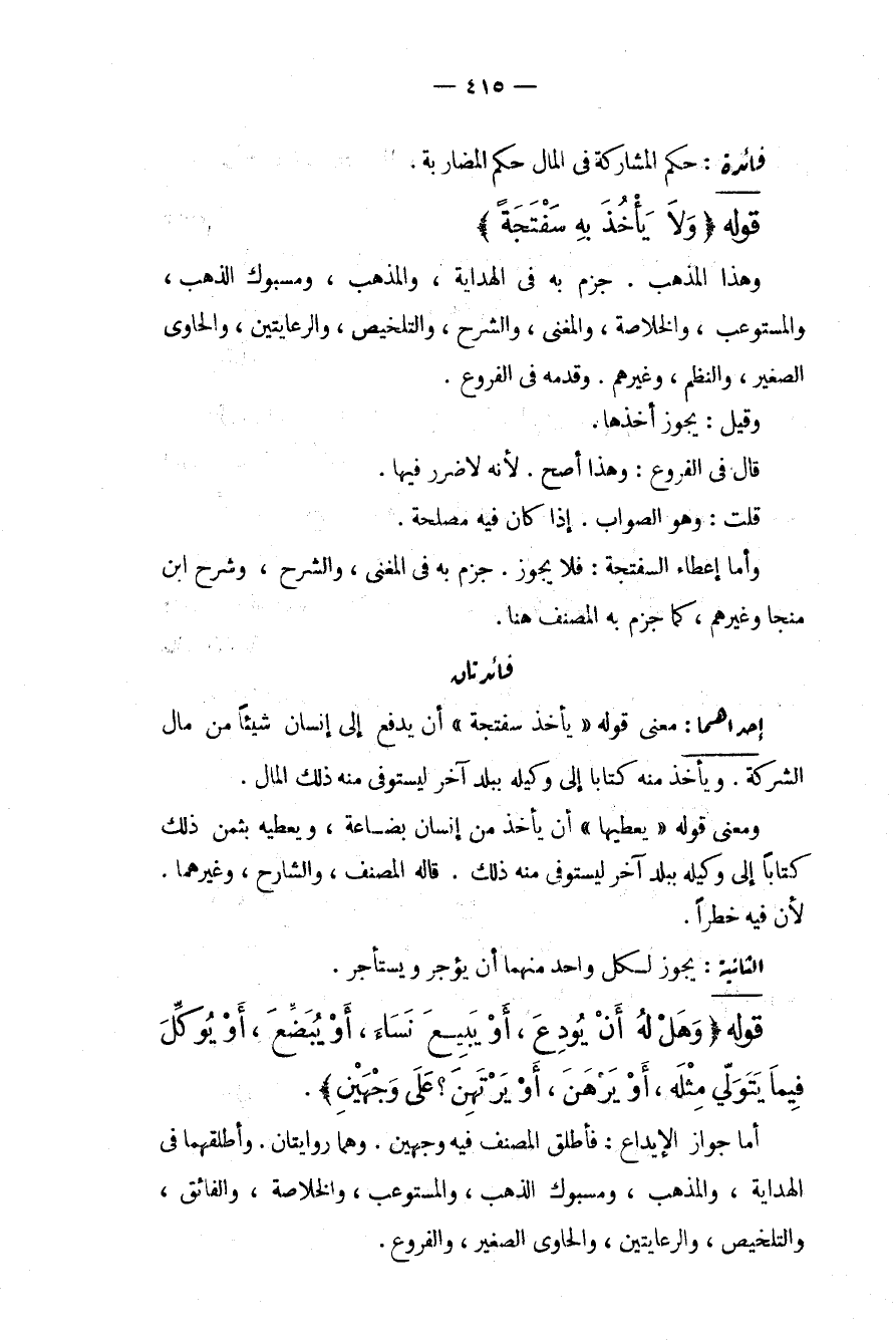 فَائِدَتَانِ إحْدَاهُمَا: مَعْنَى قَوْلِهِ " يَأْخُذُ سَفْتَجَةً " أَنْ يَدْفَعَ إلَى إنْسَانٍ شَيْئًا مِنْ مَالِ الشَّرِكَةِ. وَيَأْخُذَ مِنْهُ كِتَابًا إلَى وَكِيلِهِ بِبَلَدٍ آخَرَ لِيَسْتَوْفِيَ مِنْهُ ذَلِكَ الْمَالَ. وَمَعْنَى قَوْلِهِ " يُعْطِيهَا " أَنْ يَأْخُذَ مِنْ إنْسَانٍ بِضَاعَةً، وَيُعْطِيَهُ بِثَمَنِ ذَلِكَ كِتَابًا إلَى وَكِيلِهِ بِبَلَدٍ آخَرَ لِيَسْتَوْفِيَ مِنْهُ ذَلِكَ. قَالَهُ الْمُصَنِّفُ، وَالشَّارِحُ، وَغَيْرُهُمَا؛ لِأَنَّ فِيهِ خَطَرًا.