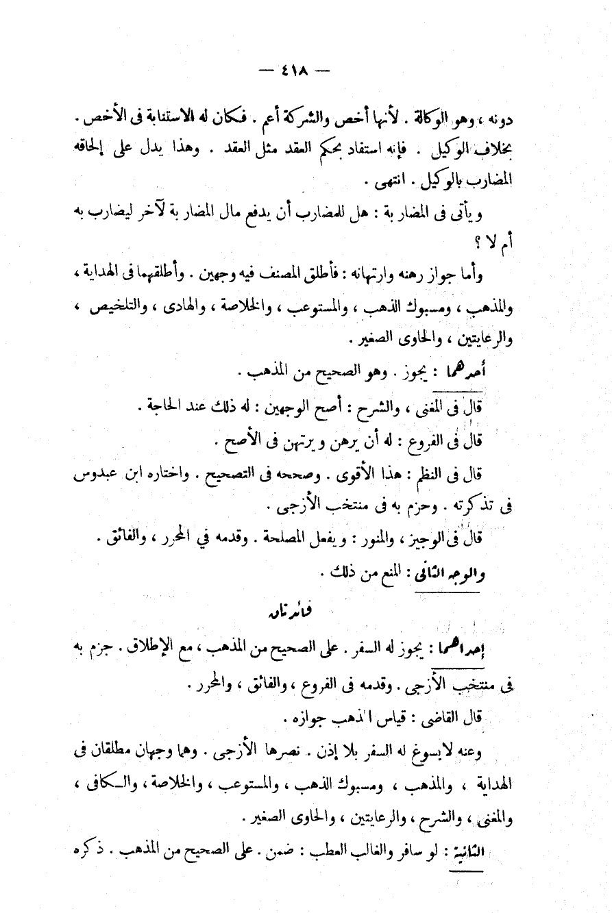 وَيَأْتِي فِي الْمُضَارَبَةِ: هَلْ لِلْمُضَارِبِ أَنْ يَدْفَعَ مَالَ الْمُضَارَبَةِ لِآخَرَ لِيُضَارِبَ بِهِ أَمْ لَا؟ وَأَمَّا جَوَازُ رَهْنِهِ وَارْتِهَانِهِ: فَأَطْلَقَ الْمُصَنِّفُ فِيهِ وَجْهَيْنِ. وَأَطْلَقَهُمَا فِي الْهِدَايَةِ، وَالْمُذْهَبِ، وَمَسْبُوكِ الذَّهَبِ، وَالْمُسْتَوْعِبِ، وَالْخُلَاصَةِ، وَالْهَادِي، وَالتَّلْخِيصِ، وَالرِّعَايَتَيْنِ، وَالْحَاوِي الصَّغِيرِ.