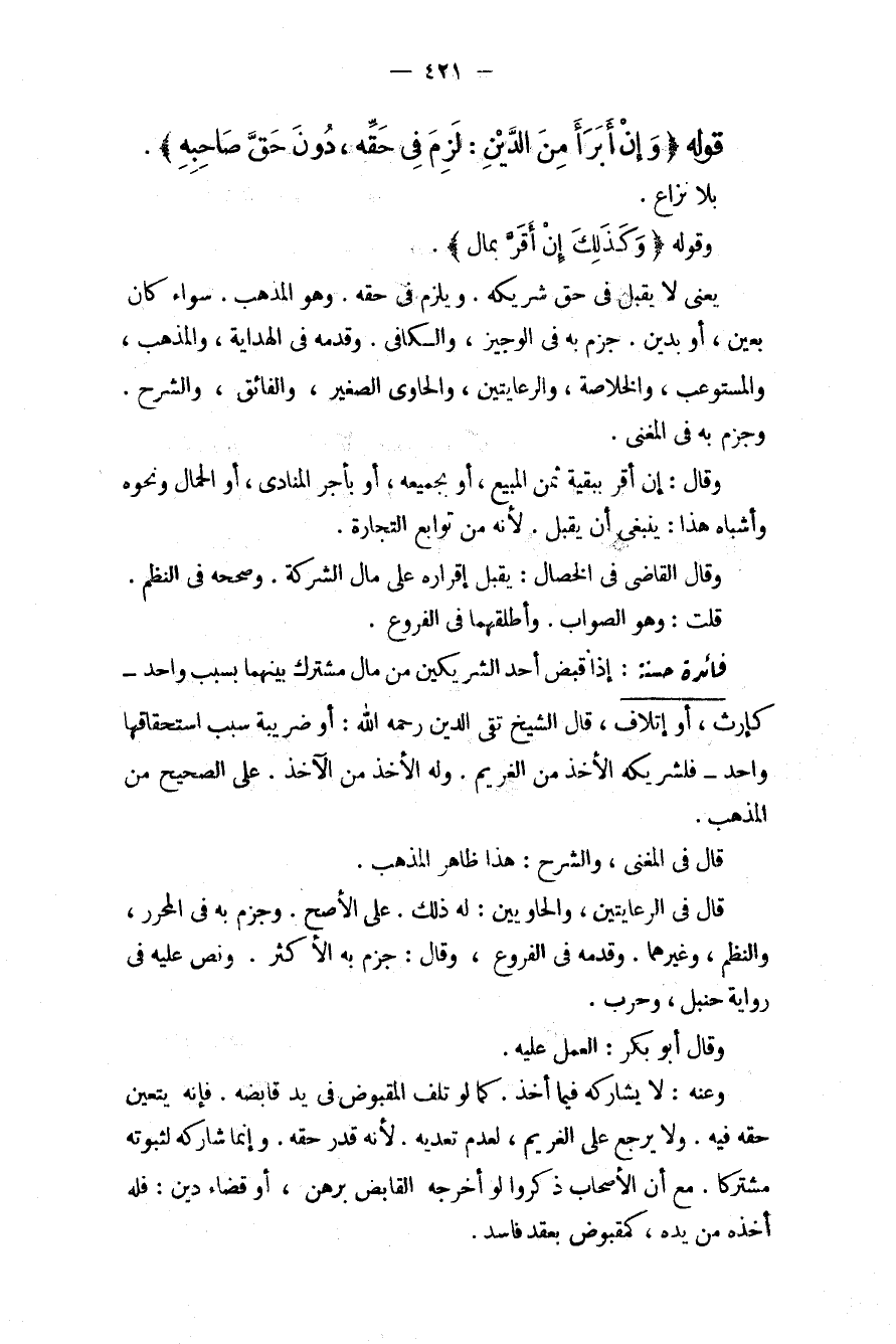 قَوْلُهُ (وَإِنْ أَبْرَأَ مِنْ الدَّيْنِ: لَزِمَ فِي حَقِّهِ، دُونَ حَقِّ صَاحِبِهِ) . بِلَا نِزَاعٍ. وَقَوْلُهُ (وَكَذَلِكَ إنْ أَقَرَّ بِمَالٍ) . يَعْنِي لَا يُقْبَلُ فِي حَقِّ شَرِيكِهِ. وَيَلْزَمُ فِي حَقِّهِ. وَهُوَ الْمَذْهَبُ. سَوَاءٌ كَانَ بِعَيْنٍ، أَوْ بِدَيْنٍ. جَزَمَ بِهِ فِي الْوَجِيزِ، وَالْكَافِي. وَقَدَّمَهُ فِي الْهِدَايَةِ، وَالْمُذْهَبِ، وَالْمُسْتَوْعِبِ، وَالْخُلَاصَةِ، وَالرِّعَايَتَيْنِ، وَالْحَاوِي الصَّغِيرِ، وَالْفَائِقِ، وَالشَّرْحِ. وَجَزَمَ بِهِ فِي الْمُغْنِي. وَقَالَ: إنْ أَقَرَّ بِبَقِيَّةِ ثَمَنِ الْمَبِيعِ، أَوْ بِجَمِيعِهِ، أَوْ بِأَجْرِ الْمُنَادِي، أَوْ الْحَمَّالِ وَنَحْوِهِ وَأَشْبَاهِ هَذَا: يَنْبَغِي أَنْ يُقْبَلَ؛ لِأَنَّهُ مِنْ تَوَابِعِ التِّجَارَةِ. وَقَالَ الْقَاضِي فِي الْخِصَالِ: يُقْبَلُ إقْرَارُهُ عَلَى مَالِ الشَّرِكَةِ. وَصَحَّحَهُ فِي النَّظْمِ. قُلْت: وَهُوَ الصَّوَابُ. وَأَطْلَقَهُمَا فِي الْفُرُوعِ.