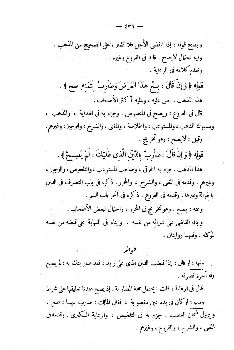 مِنْهَا: لَوْ قَالَ: إذَا قَبَضْت الدَّيْنَ الَّذِي عَلَى زَيْدٍ، فَقَدْ ضَارَبْتُك بِهِ: لَمْ يَصِحَّ وَلَهُ أُجْرَةُ تَصَرُّفِهِ. قَالَ فِي الرِّعَايَةِ، قُلْت: يُحْتَمَلُ صِحَّةُ الْمُضَارَبَةِ. إذْ يَصِحُّ عِنْدَنَا تَعْلِيقُهَا عَلَى شَرْطٍ وَمِنْهَا: لَوْ كَانَ فِي يَدِهِ عَيْنٌ مَغْصُوبَةٌ، فَقَالَ الْمَالِكُ: ضَارِبْ بِهَا: صَحَّ. وَيَزُولُ ضَمَانُ الْغَصْبِ. جَزَمَ بِهِ فِي التَّلْخِيصِ، وَالرِّعَايَةِ الْكُبْرَى. وَقَدَّمَهُ فِي الْمُغْنِي، وَالشَّرْحِ، وَالْفُرُوعِ، وَغَيْرِهِمْ.