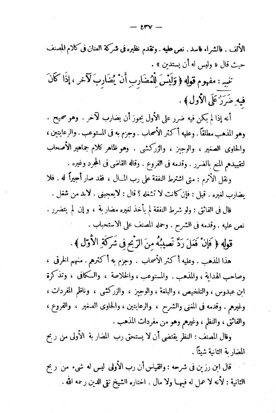 مَفْهُومُ قَوْلِهِ (وَلَيْسَ لِلْمُضَارِبِ أَنْ يُضَارِبَ لِآخَرَ، إذَا كَانَ فِيهِ ضَرَرٌ عَلَى الْأَوَّلِ) . أَنَّهُ إذَا لَمْ يَكُنْ فِيهِ ضَرَرٌ عَلَى الْأَوَّلِ يَجُوزُ أَنْ يُضَارِبَ لِآخَرَ. وَهُوَ صَحِيحٌ. وَهُوَ الْمَذْهَبُ مُطْلَقًا. وَعَلَيْهِ أَكْثَرُ الْأَصْحَابِ. وَجَزَمَ بِهِ فِي الْمُسْتَوْعِبِ. وَالرِّعَايَتَيْنِ، وَالْحَاوِي الصَّغِيرِ، وَالْوَجِيزِ، وَالزَّرْكَشِيُّ. وَهُوَ ظَاهِرُ كَلَامِ جَمَاهِيرِ الْأَصْحَابِ لِتَقْيِيدِهِمْ الْمَنْعَ بِالضَّرَرِ. وَقَدَّمَهُ فِي الْفُرُوعِ. وَقَالَهُ الْقَاضِي فِي الْمُجَرَّدِ وَغَيْرِهِ. وَنَقَلَ الْأَثْرَمُ: مَتَى اشْتَرَطَ النَّفَقَةَ عَلَى رَبِّ الْمَالِ، فَقَدْ صَارَ أَجِيرًا لَهُ. فَلَا يُضَارِبُ لِغَيْرِهِ. قِيلَ: فَإِنْ كَانَتْ لَا تَشْغَلُهُ؟ قَالَ: لَا يُعْجِبُنِي. لَا بُدَّ مِنْ شُغْلٍ. قَالَ فِي الْفَائِقِ: وَلَوْ شَرَطَ النَّفَقَةَ لَمْ يَأْخُذْ لِغَيْرِهِ مُضَارَبَةً، وَإِنْ لَمْ يَتَضَرَّرْ. نَصَّ عَلَيْهِ. وَقَدَّمَهُ فِي الشَّرْحِ. وَحَمَلَهُ الْمُصَنِّفُ عَلَى الِاسْتِحْبَابِ. قَوْلُهُ (فَإِنْ فَعَلَ رَدَّ نَصِيبَهُ مِنْ الرِّبْحِ فِي شَرِكَةِ الْأَوَّلِ) . هَذَا الْمَذْهَبُ. وَعَلَيْهِ أَكْثَرُ الْأَصْحَابِ. وَجَزَمَ بِهِ أَكْثَرُهُمْ. مِنْهُمْ الْخِرَقِيُّ، وَصَاحِبُ الْهِدَايَةِ، وَالْمُذْهَبِ. وَالْمُسْتَوْعِبِ، وَالْخُلَاصَةِ، وَالْكَافِي، وَتَذْكِرَةِ ابْنِ عَبْدُوسٍ، وَالتَّلْخِيصِ، وَالْبُلْغَةِ، وَالْوَجِيزِ، وَالزَّرْكَشِيُّ، وَنَاظِمُ الْمُفْرَدَاتِ، وَغَيْرُهُمْ. وَقَدَّمَهُ فِي الْمُغْنِي وَالشَّرْحِ، وَالرِّعَايَتَيْنِ، وَالْحَاوِي الصَّغِيرِ، وَالْفُرُوعِ، وَالْفَائِقِ، وَالنَّظْمِ، وَغَيْرِهِمْ وَهُوَ مِنْ مُفْرَدَاتِ الْمَذْهَبِ. وَقَالَ الْمُصَنِّفُ: النَّظَرُ يَقْتَضِي أَنْ لَا يَسْتَحِقَّ رَبُّ الْمُضَارَبَةِ الْأُولَى مِنْ رِبْحِ الْمُضَارَبَةِ الثَّانِيَةِ شَيْئًا. قَالَ ابْنُ رَزِينٍ فِي شَرْحِهِ: وَالْقِيَاسُ أَنَّ رَبَّ الْأُولَى لَيْسَ لَهُ شَيْءٌ مِنْ رِبْحِ