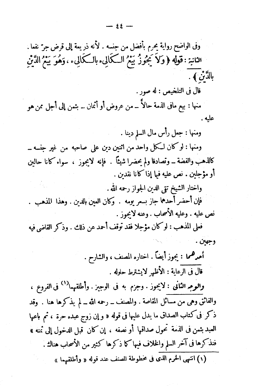 مِنْهَا: بَيْعُ مَا فِي الذِّمَّةِ حَالًّا مِنْ عُرُوضٍ أَوْ أَثْمَانٍ بِثَمَنٍ إلَى أَجَلٍ مِمَّنْ هُوَ عَلَيْهِ. وَمِنْهَا: جَعْلُ رَأْسِ مَالِ السَّلَمِ دَيْنًا. وَمِنْهَا: لَوْ كَانَ لِكُلِّ وَاحِدٍ مِنْ اثْنَيْنِ دَيْنٌ عَلَى صَاحِبِهِ مِنْ غَيْرِ جِنْسِهِ كَالذَّهَبِ وَالْفِضَّةِ وَتَصَادَقَا وَلَمْ يَحْضُرَا شَيْئًا. فَإِنَّهُ لَا يَجُوزُ، سَوَاءٌ كَانَا حَالَيْنِ أَوْ مُؤَجَّلَيْنِ. نَصَّ عَلَيْهِ فِيمَا إذَا كَانَا نَقْدَيْنِ. وَاخْتَارَ الشَّيْخُ تَقِيُّ الدِّينِ الْجَوَازَ - رَحِمَهُ اللَّهُ -. فَإِنْ أَحْضَرَ أَحَدُهُمَا جَازَ بِسِعْرِ يَوْمِهِ. وَكَانَ الْعَيْنُ بِالدَّيْنِ. وَهَذَا الْمَذْهَبُ نَصَّ عَلَيْهِ وَعَلَيْهِ الْأَصْحَابُ. وَعَنْهُ لَا يَجُوزُ. فَعَلَى الْمَذْهَبِ: لَوْ كَانَ مُؤَجَّلًا فَقَدْ تَوَقَّفَ أَحْمَدُ عَنْ ذَلِكَ. وَذَكَرَ الْقَاضِي فِيهِ وَجْهَيْنِ.