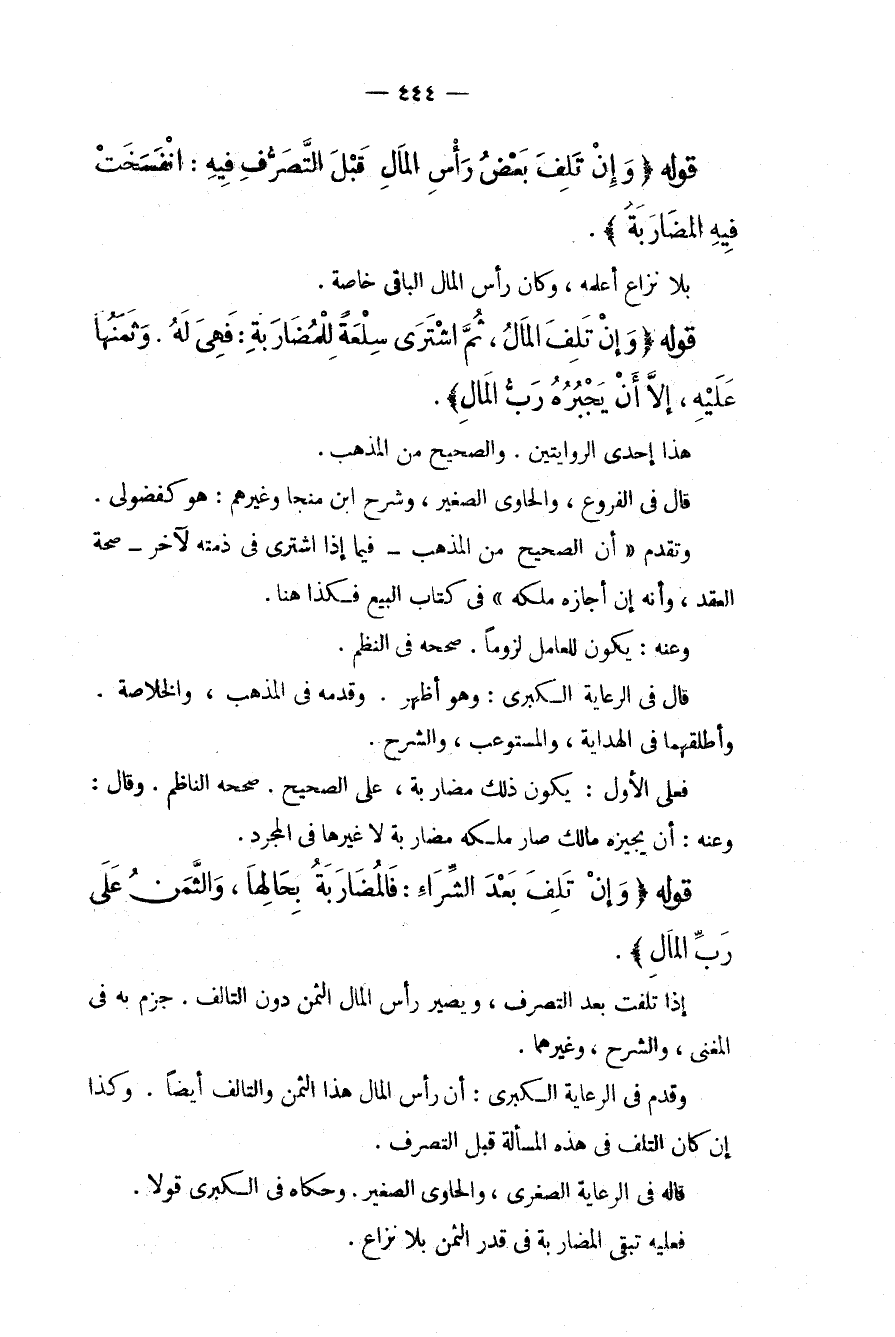 قَوْلُهُ (وَإِنْ تَلِفَ بَعْضُ رَأْسِ الْمَالِ قَبْلَ التَّصَرُّفِ فِيهِ. انْفَسَخَتْ فِيهِ الْمُضَارَبَةُ) . بِلَا نِزَاعٍ أَعْلَمُهُ، وَكَانَ رَأْسُ الْمَالِ الْبَاقِي خَاصَّةً. قَوْلُهُ (وَإِنْ تَلِفَ الْمَالُ، ثُمَّ اشْتَرَى سِلْعَةً لِلْمُضَارَبَةِ: فَهِيَ لَهُ. وَثَمَنُهَا عَلَيْهِ، إلَّا أَنْ يُجْبِرَهُ رَبُّ الْمَالِ) . هَذَا إحْدَى الرِّوَايَتَيْنِ. وَالصَّحِيحُ مِنْ الْمَذْهَبِ. قَالَ فِي الْفُرُوعِ، وَالْحَاوِي الصَّغِيرِ، وَشَرْحِ ابْنِ مُنَجَّى وَغَيْرِهِمْ: هُوَ كَفُضُولِيٍّ. وَتَقَدَّمَ " أَنَّ الصَّحِيحَ مِنْ الْمَذْهَبِ فِيمَا إذَا اشْتَرَى فِي ذِمَّتِهِ لِآخَرَ صِحَّةُ الْعَقْدِ، وَأَنَّهُ إنْ أَجَازَهُ مَلَكَهُ " فِي كِتَابِ الْبَيْعِ فَكَذَا هُنَا. وَعَنْهُ: يَكُونُ لِلْعَامِلِ لُزُومًا. صَحَّحَهُ فِي النَّظْمِ. قَالَ فِي الرِّعَايَةِ الْكُبْرَى: وَهُوَ أَظْهَرُ. وَقَدَّمَهُ فِي الْمُذْهَبِ، وَالْخُلَاصَةِ. وَأَطْلَقَهُمَا فِي الْهِدَايَةِ، وَالْمُسْتَوْعِبِ، وَالشَّرْحِ. فَعَلَى الْأَوَّلِ: يَكُونُ ذَلِكَ مُضَارَبَةً، عَلَى الصَّحِيحِ. صَحَّحَهُ النَّاظِمُ. وَقَالَ: وَعَنْهُ: أَنْ يُجِيزَهُ مَالِكٌ صَارَ مِلْكُهُ مُضَارَبَةً لَا غَيْرَهَا فِي الْمُجَرَّدِ. قَوْلُهُ (وَإِنْ تَلِفَ بَعْدَ الشِّرَاءِ: فَالْمُضَارَبَةُ بِحَالِهَا، وَالثَّمَنُ عَلَى رَبِّ الْمَالِ) . إذَا تَلِفَتْ بَعْدَ التَّصَرُّفِ، وَيَصِيرُ رَأْسُ الْمَالِ الثَّمَنِ دُونَ التَّالِفِ. جَزَمَ بِهِ فِي الْمُغْنِي، وَالشَّرْحِ، وَغَيْرِهِمَا. وَقَدَّمَ فِي الرِّعَايَةِ الْكُبْرَى: أَنَّ رَأْسَ الْمَالِ هَذَا الثَّمَنُ وَالتَّالِفُ أَيْضًا. وَكَذَا إنْ كَانَ التَّلَفُ فِي هَذِهِ الْمَسْأَلَةِ قَبْلَ التَّصَرُّفِ. قَالَهُ فِي الرِّعَايَةِ الصُّغْرَى، وَالْحَاوِي الصَّغِيرِ. وَحَكَاهُ فِي الْكُبْرَى قَوْلًا. فَعَلَيْهِ تَبْقَى الْمُضَارَبَةُ فِي قَدْرِ الثَّمَنِ بِلَا نِزَاعٍ.