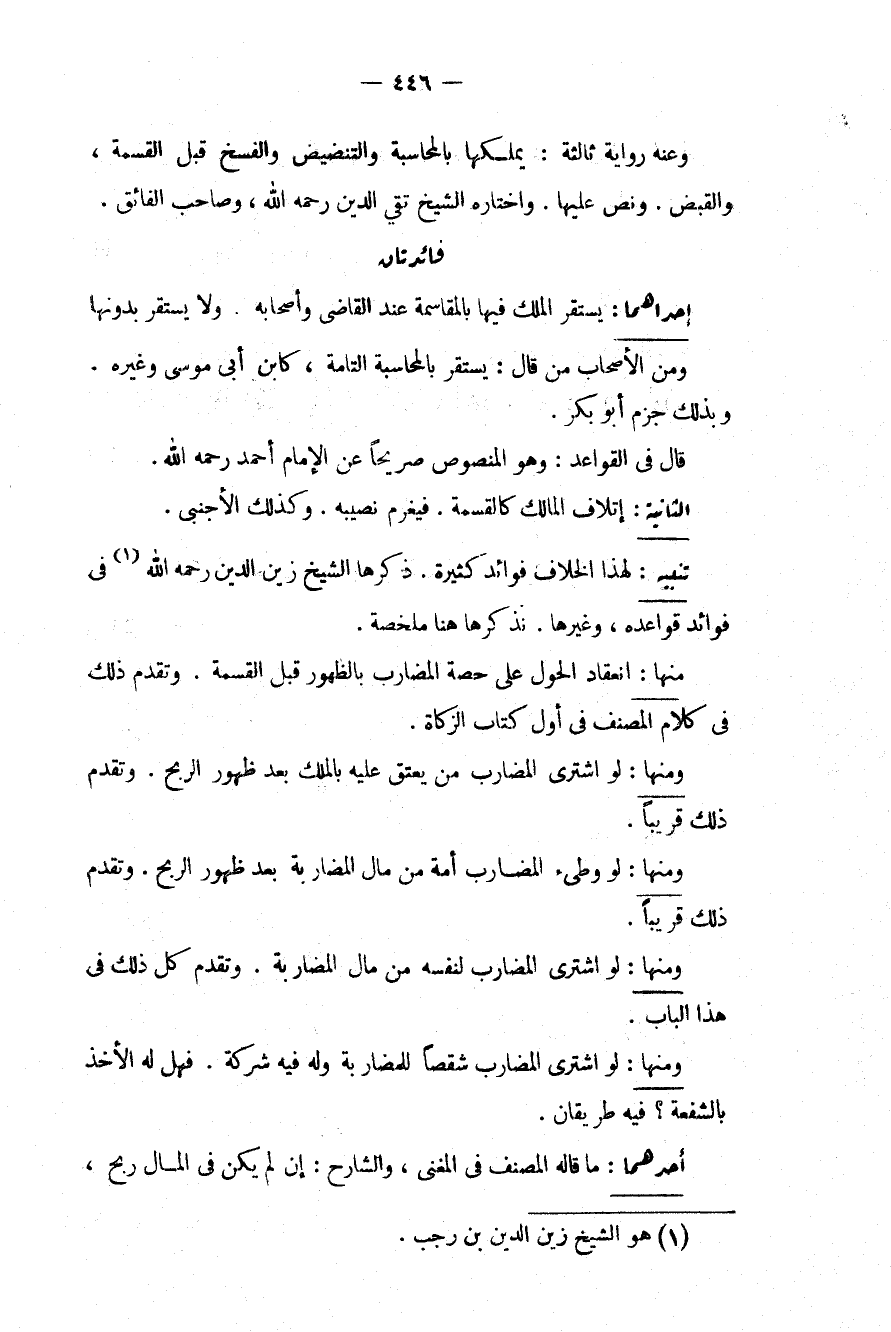 فَائِدَتَانِ إحْدَاهُمَا: يَسْتَقِرُّ الْمِلْكُ فِيهَا بِالْمُقَاسَمَةِ عِنْدَ الْقَاضِي وَأَصْحَابِهِ. وَلَا يَسْتَقِرُّ بِدُونِهَا وَمِنْ الْأَصْحَابِ مَنْ قَالَ: يَسْتَقِرُّ بِالْمُحَاسَبَةِ التَّامَّةِ. كَابْنِ أَبِي مُوسَى وَغَيْرِهِ. وَبِذَلِكَ جَزَمَ أَبُو بَكْرٍ. قَالَ فِي الْقَوَاعِدِ: وَهُوَ الْمَنْصُوصُ صَرِيحًا عَنْ الْإِمَامِ أَحْمَدَ - رَحِمَهُ اللَّهُ -.