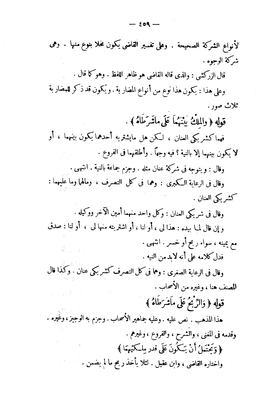 لِأَنْوَاعِ الشَّرِكَةِ الصَّحِيحَةِ. وَعَلَى تَفْسِيرِ الْقَاضِي يَكُونُ مُخِلًّا بِنَوْعٍ مِنْهَا. وَهِيَ شَرِكَةُ الْوُجُوهِ. قَالَ الزَّرْكَشِيُّ: وَاَلَّذِي قَالَهُ الْقَاضِي هُوَ ظَاهِرُ اللَّفْظِ. وَهُوَ كَمَا قَالَ. وَعَلَى هَذَا: يَكُونُ هَذَا نَوْعًا مِنْ أَنْوَاعِ الْمُضَارَبَةِ. وَيَكُونُ قَدْ ذَكَرَ لِلْمُضَارَبَةِ ثَلَاثَ صُوَرٍ. قَوْلُهُ (وَالْمِلْكُ بَيْنَهُمَا عَلَى مَا شَرَطَاهُ) . فَهُمَا كَشَرِيكَيْ الْعِنَانِ، لَكِنْ هَلْ يَشْتَرِيهِ أَحَدُهُمَا يَكُونُ بَيْنَهُمَا، أَوْ لَا يَكُونُ بَيْنَهُمَا إلَّا بِالنِّيَّةِ؟ فِيهِ وَجْهًا. وَأَطْلَقَهُمَا فِي الْفُرُوعِ. وَقَالَ: وَيَتَوَجَّهُ فِي شَرِكَةِ عِنَانٍ مِثْلُهُ. وَجَزَمَ جَمَاعَةٌ بِالنِّيَّةِ. انْتَهَى.