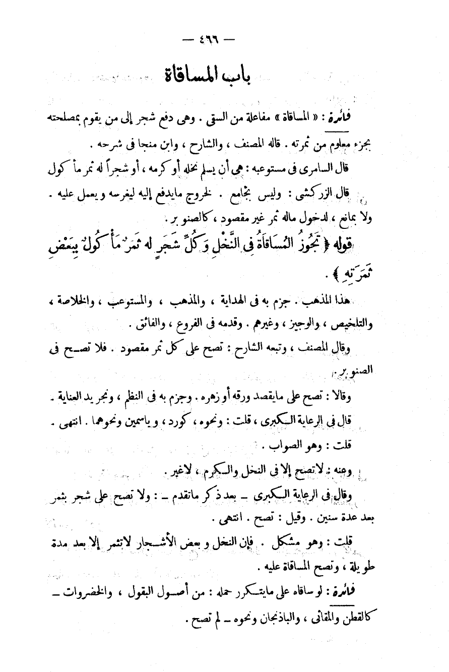 ِ فَائِدَةٌ " الْمُسَاقَاةُ " مُفَاعَلَةٌ مَنْ السَّقْيِ. وَهِيَ دَفْعُ شَجَرٍ إلَى مَنْ يَقُومُ بِمَصْلَحَتِهِ بِجُزْءٍ مَعْلُومٍ مِنْ ثَمَرَتِهِ. قَالَهُ الْمُصَنِّفُ، وَالشَّارِحُ، وَابْنُ مُنَجَّى فِي شَرْحِهِ. قَالَ السَّامِرِيُّ فِي مُسْتَوْعَبِهِ: هِيَ أَنْ يُسَلِّمَ نَخْلَهُ أَوْ كَرْمَهُ، أَوْ شَجَرًا لَهُ ثَمَرٌ مَأْكُولٌ قَالَ الزَّرْكَشِيُّ: وَلَيْسَ بِجَامِعٍ لِخُرُوجِ مَا يُدْفَعُ إلَيْهِ لِيَغْرِسَهُ وَيَعْمَلَ عَلَيْهِ. وَلَا بِمَانِعٍ، لِدُخُولِ مَا لَهُ ثَمَرُ غَيْرُ مَقْصُودٍ، كَالصَّنَوْبَرِ. قَوْلُهُ (تَجُوزُ الْمُسَاقَاةُ فِي النَّخْلِ وَكُلِّ شَجَرٍ لَهُ ثَمَرٌ مَأْكُولٌ بِبَعْضِ ثَمَرَتِهِ) . هَذَا الْمَذْهَبُ. جَزَمَ بِهِ فِي الْهِدَايَةِ، وَالْمُذْهَبِ، وَالْمُسْتَوْعِبِ، وَالْخُلَاصَةِ، وَالتَّلْخِيصِ، وَالْوَجِيزِ، وَغَيْرُهُمْ. وَقَدَّمَهُ فِي الْفُرُوعِ، وَالْفَائِقِ. وَقَالَ الْمُصَنِّفُ، وَتَبِعَهُ الشَّارِحُ: تَصِحُّ عَلَى كُلِّ ثَمَرٍ مَقْصُودٍ. فَلَا تَصِحُّ فِي الصَّنَوْبَرِ. وَقَالَا: تَصِحُّ عَلَى مَا يُقْصَدُ وَرَقُهُ أَوْ زَهْرُهُ. وَجَزَمَ بِهِ فِي النَّظْمِ، وَتَجْرِيدِ الْعِنَايَةِ. قَالَ فِي الرِّعَايَةِ الْكُبْرَى، قُلْت: وَنَحْوِهِ، كَوَرْدٍ، وَيَاسَمِينٍ وَنَحْوِهِمَا. انْتَهَى.