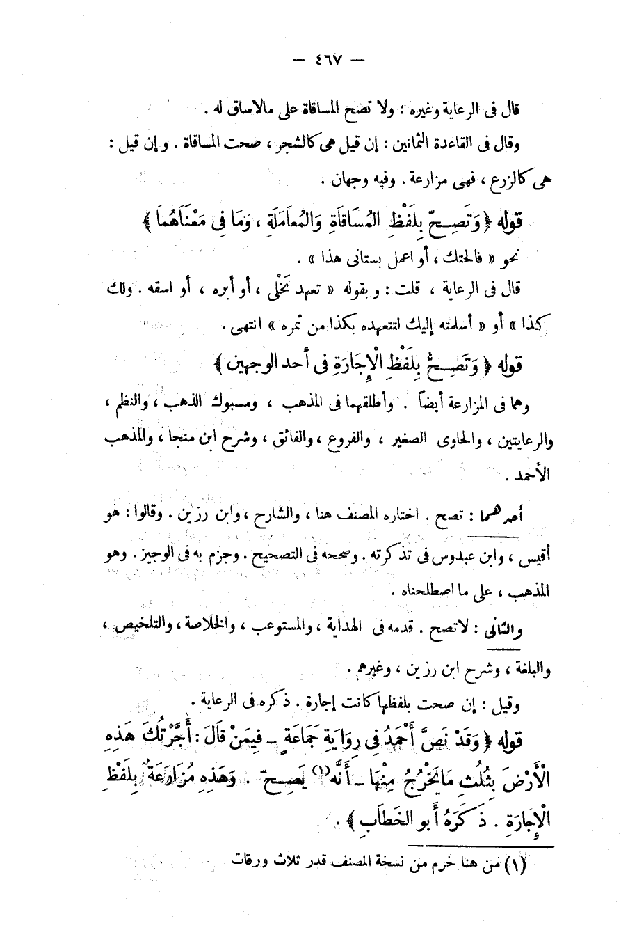 قَوْلُهُ (وَتَصِحُّ بِلَفْظِ الْإِجَارَةِ فِي أَحَدِ الْوَجْهَيْنِ) وَهُمَا فِي الْمُزَارَعَةِ أَيْضًا. وَأَطْلَقَهُمَا فِي الْمُذْهَبِ، وَمَسْبُوكِ الذَّهَبِ، وَالنَّظْمِ، وَالرِّعَايَتَيْنِ، وَالْحَاوِي الصَّغِيرِ، وَالْفُرُوعِ، وَالْفَائِقِ، وَشَرْحِ ابْنِ مُنَجَّى، وَالْمَذْهَبِ الْأَحْمَدِ.