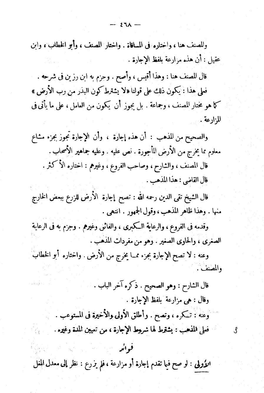 وَقَدَّمَهُ فِي الْفُرُوعِ، وَالرِّعَايَةِ الْكُبْرَى، وَالْفَائِقِ وَغَيْرُهُمْ. وَجَزَمَ بِهِ فِي الرِّعَايَةِ الصُّغْرَى، وَالْحَاوِي الصَّغِيرِ. وَهُوَ مِنْ مُفْرَدَاتِ الْمَذْهَبِ. وَعَنْهُ: لَا تَصِحُّ الْإِجَارَةُ بِجُزْءٍ مِمَّا يَخْرُجُ مِنْ الْأَرْضِ. وَاخْتَارَهُ أَبُو الْخَطَّابِ وَالْمُصَنِّفُ. قَالَ الشَّارِحُ: وَهُوَ الصَّحِيحُ. ذَكَرَهُ آخِرَ الْبَابِ. وَقَالَ: هِيَ مُزَارَعَةٌ بِلَفْظِ الْإِجَارَةِ. وَعَنْهُ: تُكْرَهُ، وَتَصِحُّ. وَأَطْلَقَ الْأُولَى وَالْأَخِيرَةَ فِي الْمُسْتَوْعِبِ. فَعَلَى الْمَذْهَبِ: يُشْتَرَطُ لَهَا شُرُوطُ الْإِجَارَةِ، مِنْ تَعْيِينِ الْمُدَّةِ وَغَيْرِهِ. فَوَائِدُ الْأُولَى: لَوْ صَحَّ فِيمَا تَقَدَّمَ إجَارَةٌ أَوْ مُزَارَعَةٌ، فَلَمْ يَزْرَعْ: نُظِرَ إلَى مُعَدَّلِ الْمُغَلِّ