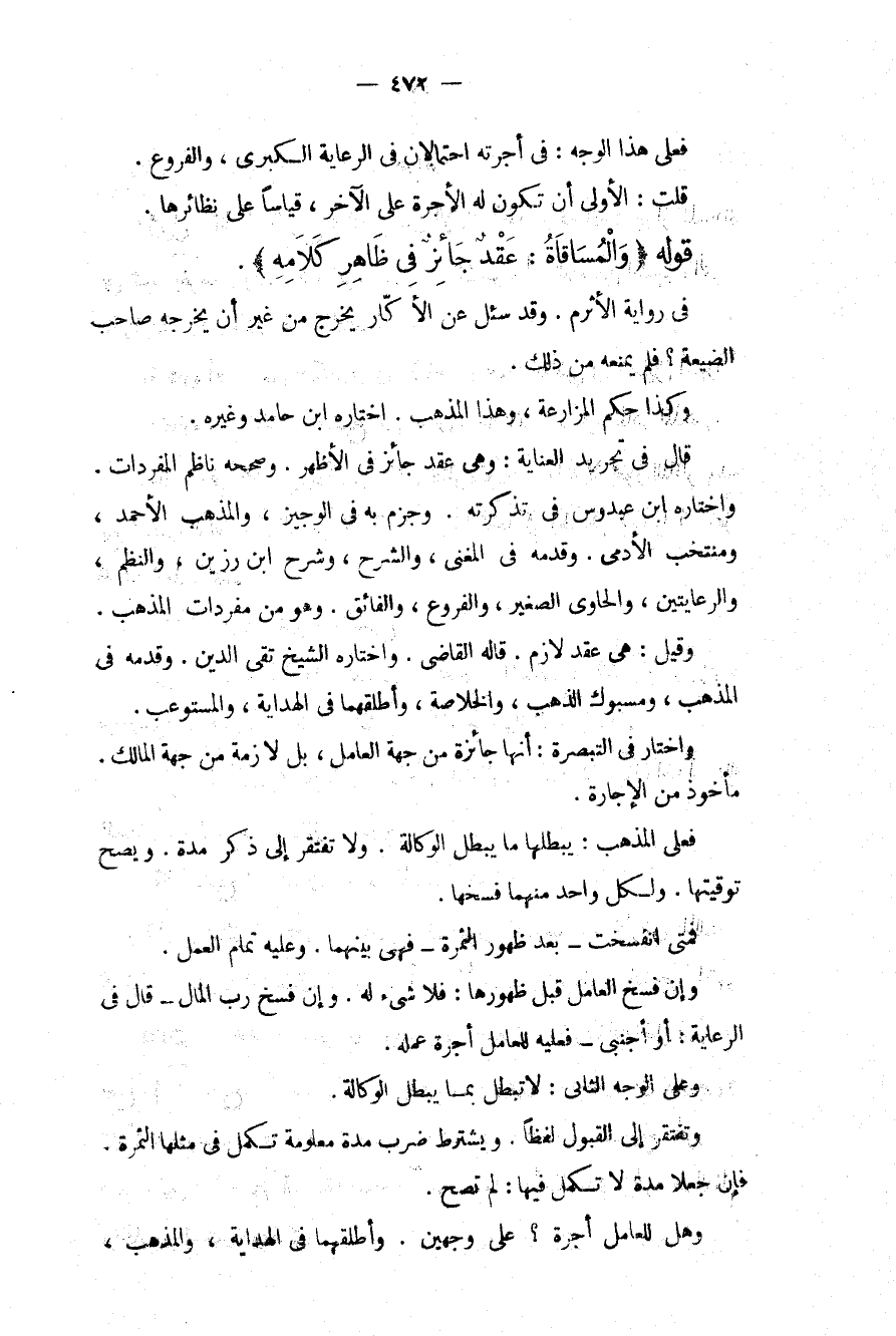 قَوْلُهُ (وَالْمُسَاقَاةُ: عَقْدٌ جَائِزٌ فِي ظَاهِرِ كَلَامِهِ) . فِي رِوَايَةِ الْأَثْرَمِ. وَقَدْ سُئِلَ عَنْ الْأَكَّارِ يَخْرُجُ مِنْ غَيْرِ أَنْ يُخْرِجَهُ صَاحِبُ الضَّيْعَةِ؟ فَلَمْ يَمْنَعْهُ مِنْ ذَلِكَ. وَكَذَا حُكْمُ الْمُزَارَعَةِ، وَهَذَا الْمَذْهَبُ اخْتَارَهُ ابْنُ حَامِدٍ وَغَيْرُهُ. قَالَ فِي تَجْرِيدِ الْعِنَايَةِ: وَهِيَ عَقْدٌ جَائِزٌ فِي الْأَظْهَرِ. وَصَحَّحَهُ نَاظِمُ الْمُفْرَدَاتِ. وَاخْتَارَهُ ابْنُ عَبْدُوسٍ فِي تَذْكِرَتِهِ. وَجَزَمَ بِهِ فِي الْوَجِيزِ، وَالْمَذْهَبِ الْأَحْمَدِ، وَمُنْتَخَبِ الْأَدَمِيِّ. وَقَدَّمَهُ فِي الْمُغْنِي، وَالشَّرْحِ، وَشَرْحِ ابْنِ رَزِينٍ، وَالنَّظْمِ، وَالرِّعَايَتَيْنِ، وَالْحَاوِي الصَّغِيرِ، وَالْفُرُوعِ، وَالْفَائِقِ. وَهُوَ مِنْ مُفْرَدَاتِ الْمَذْهَبِ. وَقِيلَ: هِيَ عَقْدٌ لَازِمٌ. قَالَهُ الْقَاضِي. وَاخْتَارَهُ الشَّيْخُ تَقِيُّ الدِّينِ. وَقَدَّمَهُ فِي الْمُذْهَبِ، وَمَسْبُوكِ الذَّهَبِ، وَالْخُلَاصَةِ، وَأَطْلَقَهُمَا فِي الْهِدَايَةِ، وَالْمُسْتَوْعِبِ. وَاخْتَارَ فِي التَّبْصِرَةِ: أَنَّهَا جَائِزَةٌ مِنْ جِهَةِ الْعَامِلِ، بَلْ لَازِمَةٌ مِنْ جِهَةِ الْمَالِكِ. مَأْخُوذٌ مِنْ الْإِجَارَةِ. فَعَلَى الْمَذْهَبِ: يُبْطِلُهَا مَا يُبْطِلُ الْوَكَالَةَ. وَلَا تَفْتَقِرُ إلَى ذِكْرِ مُدَّةٍ. وَيَصِحُّ تَوْقِيتُهَا. وَلِكُلِّ وَاحِدٍ مِنْهُمَا فَسْخُهَا. فَمَتَى انْفَسَخَتْ بَعْدَ ظُهُورِ الثَّمَرَةِ فَهِيَ بَيْنَهُمَا. وَعَلَيْهِ تَمَامُ الْعَمَلِ. وَإِنْ فَسَخَ الْعَامِلُ قَبْلَ ظُهُورِهَا: فَلَا شَيْءَ لَهُ. وَإِنْ فَسَخَ رَبُّ الْمَالِ قَالَ فِي الرِّعَايَةِ: أَوْ أَجْنَبِيٌّ فَعَلَيْهِ لِلْعَامِلِ أُجْرَةُ عَمَلِهِ. وَعَلَى الْوَجْهِ الثَّانِي: لَا تَبْطُلُ بِمَا يُبْطِلُ الْوَكَالَةَ. وَتَفْتَقِرُ إلَى الْقَبُولِ لَفْظًا. وَيُشْتَرَطُ ضَرْبُ مُدَّةٍ مَعْلُومَةٍ تَكْمُلُ فِي مِثْلِهَا الثَّمَرَةُ. فَإِنْ جَعَلَا مُدَّةً لَا تَكْمُلُ فِيهَا: لَمْ تَصِحَّ. وَهَلْ لِلْعَامِلِ أُجْرَةٌ؟ عَلَى وَجْهَيْنِ. وَأَطْلَقَهُمَا فِي الْهِدَايَةِ، وَالْمُذْهَبِ،