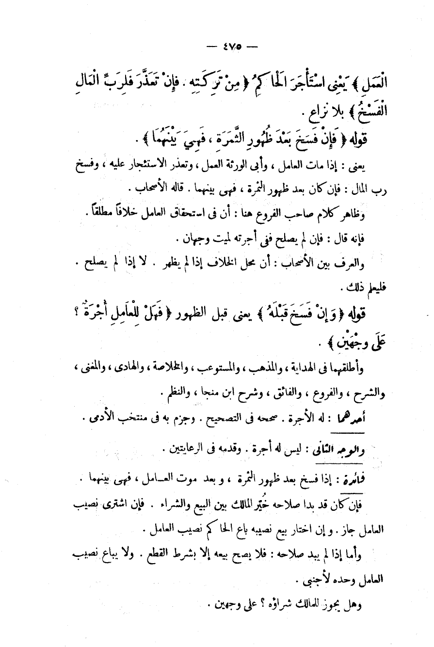 قَوْلُهُ (فَإِنْ فَسَخَ بَعْدَ ظُهُورِ الثَّمَرَةِ، فَهِيَ بَيْنَهُمَا) . يَعْنِي: إذَا مَاتَ الْعَامِلُ، وَأَبَى الْوَرَثَةُ الْعَمَلَ، وَتَعَذَّرَ الِاسْتِئْجَارُ عَلَيْهِ، وَفَسَخَ رَبُّ الْمَالِ: فَإِنْ كَانَ بَعْدَ ظُهُورِ الثَّمَرَةِ، فَهِيَ بَيْنَهُمَا. قَالَهُ الْأَصْحَابُ. وَظَاهِرُ كَلَامِ صَاحِبِ الْفُرُوعِ هُنَا: أَنَّ فِي اسْتِحْقَاقِ الْعَامِلِ خِلَافًا مُطْلَقًا. فَإِنَّهُ قَالَ: فَإِنْ لَمْ يَصْلُحْ فَفِي أُجْرَتِهِ لِمَيِّتٍ وَجْهَانِ. وَالْعُرْفُ بَيْنَ الْأَصْحَابِ: أَنَّ مَحَلَّ الْخِلَافِ إذَا لَمْ يَظْهَرْ. لَا إذَا لَمْ يَصْلُحْ. فَلْيُعْلَمْ ذَلِكَ. قَوْلُهُ (وَإِنْ فُسِخَ قَبْلَهُ) يَعْنِي قَبْلَ الظُّهُورِ (فَهَلْ لِلْعَامِلِ أُجْرَةٌ؟ عَلَى وَجْهَيْنِ) . وَأَطْلَقَهُمَا فِي الْهِدَايَةِ، وَالْمُذْهَبِ، وَالْمُسْتَوْعِبِ، وَالْخُلَاصَةِ، وَالْهَادِي، وَالْمُغْنِي، وَالشَّرْحِ، وَالْفُرُوعِ، وَالْفَائِقِ، وَشَرْحِ ابْنِ مُنَجَّى، وَالنَّظْمِ.