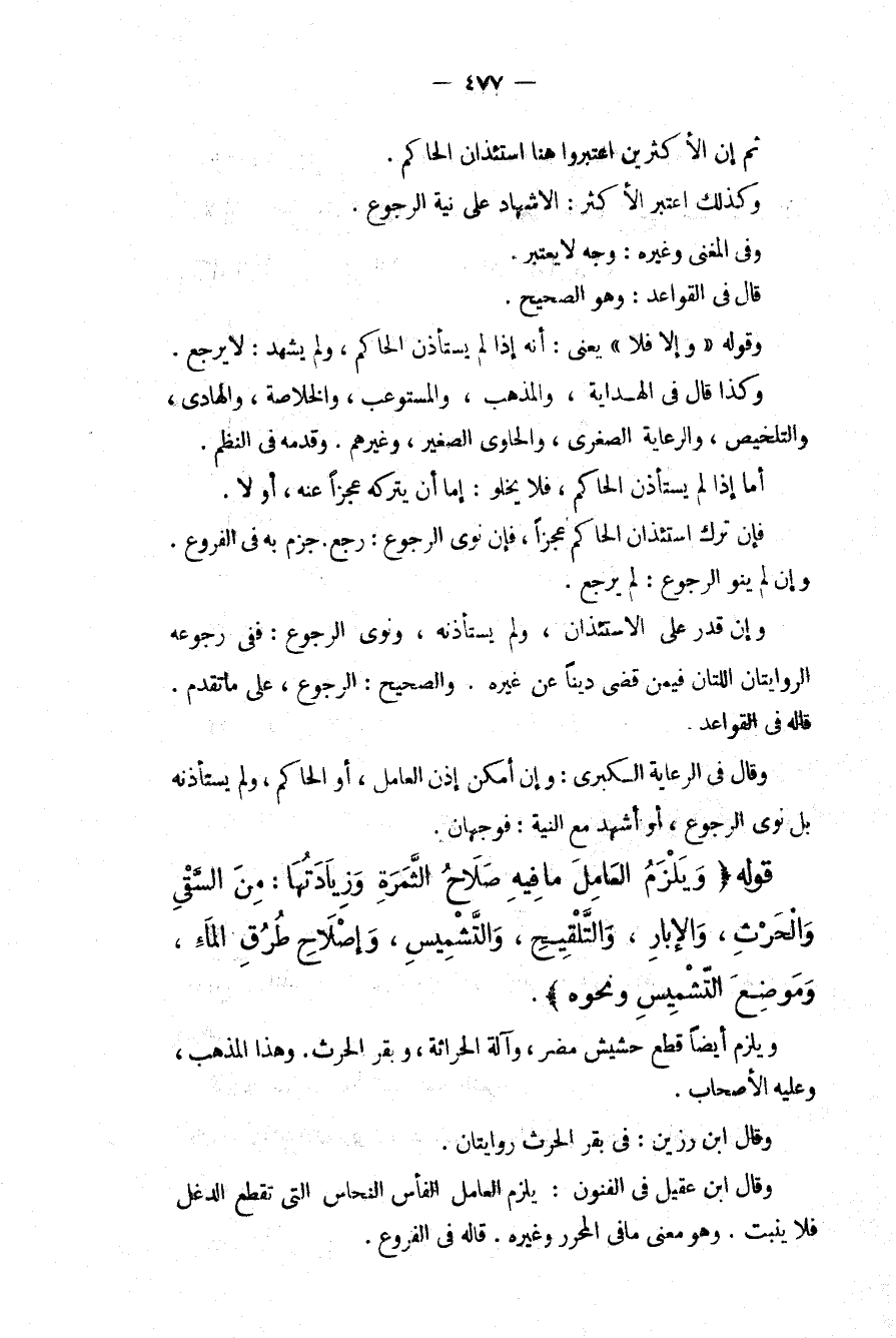 ثُمَّ إنَّ الْأَكْثَرِينَ اعْتَبَرُوا هُنَا اسْتِئْذَانَ الْحَاكِمِ. وَكَذَلِكَ اعْتَبَرَ الْأَكْثَرُ: الْإِشْهَادَ عَلَى نِيَّةِ الرُّجُوعِ. وَفِي الْمُغْنِي وَغَيْرِهِ: وَجْهٌ لَا يُعْتَبَرُ. قَالَ فِي الْقَوَاعِدِ: وَهُوَ الصَّحِيحُ. وَقَوْلُهُ " وَإِلَّا فَلَا " يَعْنِي: أَنَّهُ إذَا لَمْ يَسْتَأْذِنْ الْحَاكِمَ، وَلَمْ يُشْهِدْ: لَا يَرْجِعُ. وَكَذَا قَالَ فِي الْهِدَايَةِ، وَالْمُذْهَبِ، وَالْمُسْتَوْعِبِ، وَالْخُلَاصَةِ، وَالْهَادِي، وَالتَّلْخِيصِ، وَالرِّعَايَةِ الصُّغْرَى، وَالْحَاوِي الصَّغِيرِ، وَغَيْرِهِمْ. وَقَدَّمَهُ فِي النَّظْمِ. أَمَّا إذَا لَمْ يَسْتَأْذِنْ الْحَاكِمَ، فَلَا يَخْلُو: إمَّا أَنْ يَتْرُكَهُ عَجْزًا عَنْهُ، أَوْ لَا. فَإِنْ تَرَكَ اسْتِئْذَانَ الْحَاكِمِ عَجْزًا، فَإِنْ نَوَى الرُّجُوعَ: رَجَعَ جَزَمَ بِهِ فِي الْفُرُوعِ. وَإِنْ لَمْ يَنْوِ الرُّجُوعَ: لَمْ يَرْجِعْ. وَإِنْ قَدَرَ عَلَى الِاسْتِئْذَانِ، وَلَمْ يَسْتَأْذِنْهُ، وَنَوَى الرُّجُوعَ: فَفِي رُجُوعِهِ الرِّوَايَتَانِ اللَّتَانِ فِيمَنْ قَضَى دَيْنًا عَنْ غَيْرِهِ. وَالصَّحِيحُ: الرُّجُوعُ، عَلَى مَا تَقَدَّمَ. قَالَهُ فِي الْقَوَاعِدِ. وَقَالَ فِي الرِّعَايَةِ الْكُبْرَى: وَإِنْ أَمْكَنَ إذْنُ الْعَامِلِ، أَوْ الْحَاكِمِ، وَلَمْ يَسْتَأْذِنْهُ بَلْ نَوَى الرُّجُوعَ، أَوْ أَشْهَدَ مَعَ النِّيَّةِ: فَوَجْهَانِ.