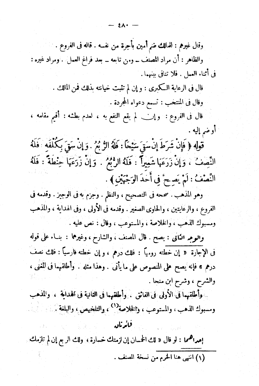 قَوْلُهُ (فَإِنْ شَرَطَ إنْ سَقَى سَيْحًا: فَلَهُ الرُّبُعُ. وَإِنْ سَقَى بِكُلْفَةٍ. فَلَهُ النِّصْفُ، وَإِنْ زَرَعَهَا شَعِيرًا: فَلَهُ الرُّبُعُ. وَإِنْ زَرَعَهَا حِنْطَةً: فَلَهُ النِّصْفُ: لَمْ يَصِحَّ فِي أَحَدِ الْوَجْهَيْنِ) . وَهُوَ الْمَذْهَبُ. صَحَّحَهُ فِي التَّصْحِيحِ، وَالنَّظْمِ. وَجَزَمَ بِهِ فِي الْوَجِيزِ. وَقَدَّمَهُ فِي الْفُرُوعِ، وَالرِّعَايَتَيْنِ، وَالْحَاوِي الصَّغِيرِ. وَقَدَّمَهُ فِي الْأُولَى، وَفِي الْهِدَايَةِ، وَالْمُذْهَبِ وَمَسْبُوكِ الذَّهَبِ، وَالْخُلَاصَةِ، وَالْمُسْتَوْعِبِ، وَقَالَ: نَصَّ عَلَيْهِ. وَالْوَجْهُ الثَّانِي: يَصِحُّ. قَالَ الْمُصَنِّفُ، وَالشَّارِحُ، وَغَيْرُهُمَا: بِنَاءً عَلَى قَوْلِهِ فِي الْإِجَارَةِ " إنْ خِطْتَهُ رُومِيًّا: فَلَكَ دِرْهَمٌ، وَإِنْ خِطْتَهُ فَارِسِيًّا: فَلَكَ نِصْفُ دِرْهَمٍ " فَإِنَّهُ يَصِحُّ عَلَى الْمَنْصُوصِ عَلَى مَا يَأْتِي. وَهَذَا مِثْلُهُ. وَأَطْلَقَهُمَا فِي الْمُغْنِي، وَالشَّرْحِ، وَشَرْحِ ابْنِ مُنَجَّى. وَأَطْلَقَهُمَا فِي الْأُولَى فِي الْفَائِقِ. وَأَطْلَقَهُمَا فِي الثَّانِيَةِ فِي الْهِدَايَةِ، وَالْمُذْهَبِ وَمَسْبُوكِ الذَّهَبِ، وَالْمُسْتَوْعِبِ، وَالْخُلَاصَةِ، وَالتَّلْخِيصِ، وَالْبُلْغَةِ. فَائِدَتَانِ إحْدَاهُمَا: لَوْ قَالَ " لَك الْخُمُسَانِ إنْ لَزِمَتْك خَسَارَةٌ، وَلَك الرُّبْعُ إنْ لَمْ تَلْزَمْك