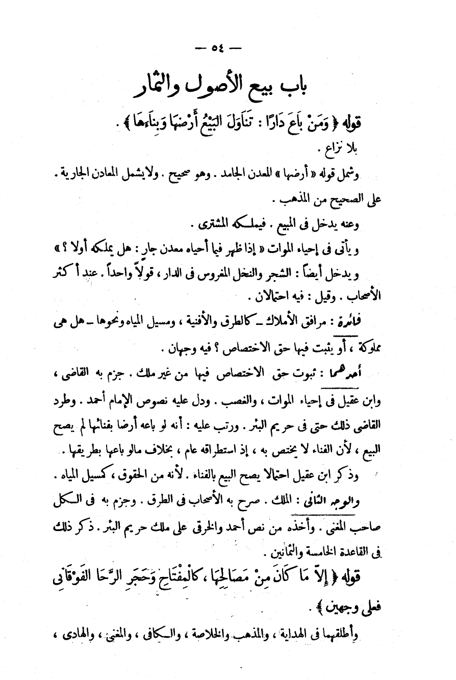 ِ قَوْلُهُ (وَمَنْ بَاعَ دَارًا: تَنَاوَلَ الْبَيْعُ أَرْضَهَا وَبِنَاءَهَا) بِلَا نِزَاعٍ. وَشَمِلَ قَوْلُهُ " أَرْضَهَا " الْمَعْدِنَ الْجَامِدَ. وَهُوَ صَحِيحٌ وَلَا يَشْمَلُ الْمَعَادِنَ الْجَارِيَةَ. عَلَى الصَّحِيحِ مِنْ الْمَذْهَبِ وَعَنْهُ يَدْخُلُ فِي الْمَبِيعِ. فَيَمْلِكُهُ الْمُشْتَرِي. وَيَأْتِي فِي إحْيَاءِ الْمَوَاتِ " إذَا ظَهَرَ فِيمَا أَحْيَاهُ مَعْدِنٌ جَارٍ: هَلْ يَمْلِكُهُ أَوْ لَا؟ " وَيَدْخُلُ أَيْضًا: الشَّجَرُ وَالنَّخْلُ الْمَغْرُوسُ فِي الدَّارِ، قَوْلًا وَاحِدًا. عِنْدَ أَكْثَرِ الْأَصْحَابِ. وَقِيلَ فِيهِ احْتِمَالَانِ.