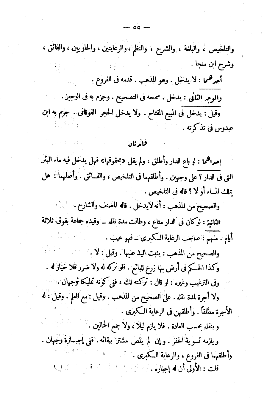 إحْدَاهُمَا: لَوْ بَاعَ الدَّارَ وَأَطْلَقَ، وَلَمْ يَقُلْ " بِحُقُوقِهَا " فَهَلْ يَدْخُلُ فِيهِ مَاءُ الْبِئْرِ الَّتِي فِي الدَّارِ؟ عَلَى وَجْهَيْنِ وَأَطْلَقَهُمَا فِي التَّلْخِيصِ، وَالْفَائِقِ وَأَصْلُهُمَا: هَلْ يَمْلِكُ الْمَاءَ أَوْ لَا؟ قَالَهُ فِي التَّلْخِيصِ. وَالصَّحِيحُ مِنْ الْمَذْهَبِ: أَنَّهُ لَا يَدْخُلُ. قَالَهُ الْمُصَنِّفُ وَالشَّارِحُ.