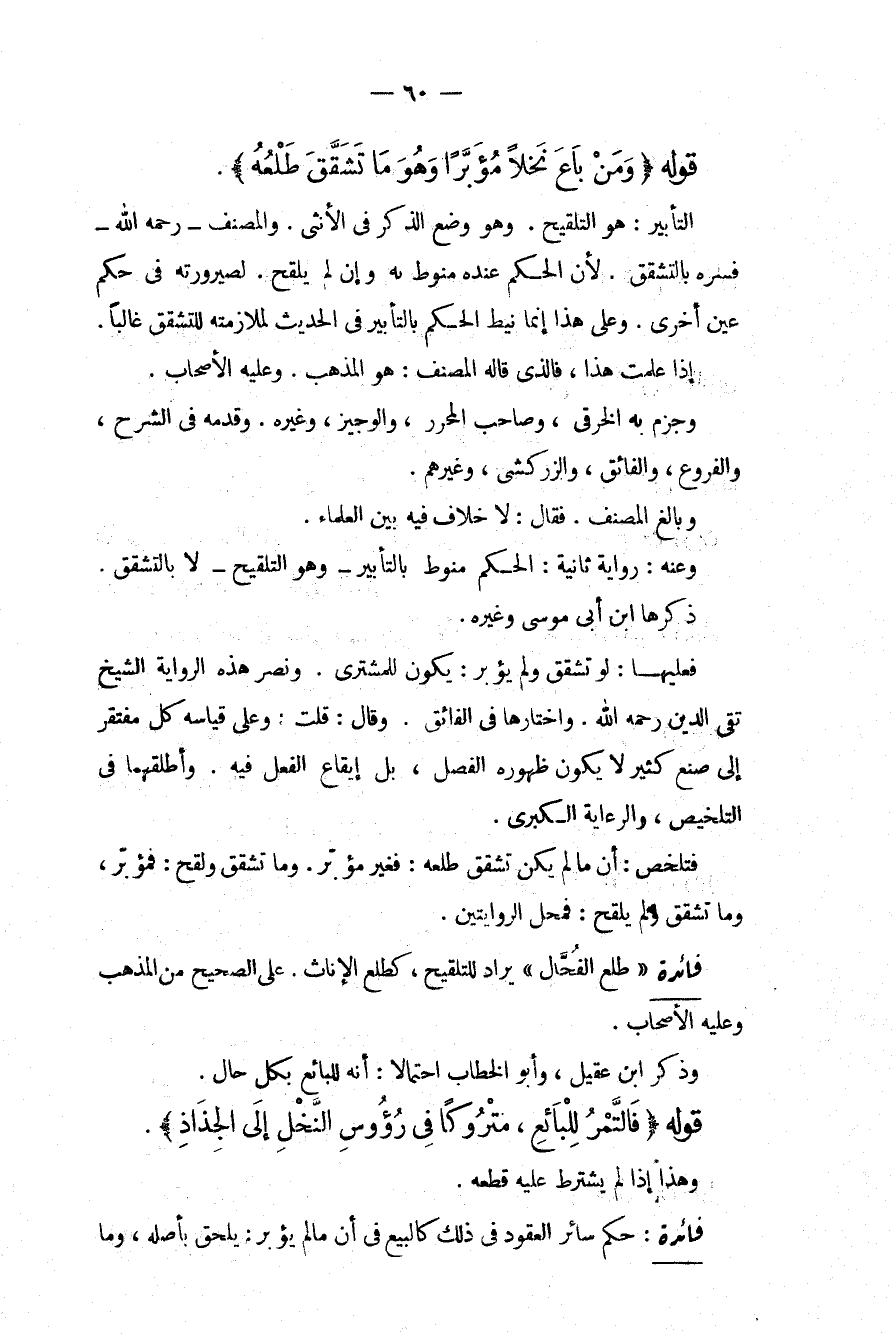 قَوْلُهُ (وَمَنْ بَاعَ نَخْلًا مُؤَبَّرًا وَهُوَ مَا تَشَقَّقَ طَلْعُهُ) التَّأْبِيرُ: هُوَ التَّلْقِيحُ. وَهُوَ وَضْعُ الذَّكَرِ فِي الْأُنْثَى. وَالْمُصَنِّفُ - رَحِمَهُ اللَّهُ - فَسَّرَهُ بِالتَّشَقُّقِ لِأَنَّ الْحُكْمَ عِنْدَهُ مَنُوطٌ بِهِ وَإِنْ لَمْ يُلَقِّحْ. لِصَيْرُورَتِهِ فِي حُكْمِ عَيْنٍ أُخْرَى. وَعَلَى هَذَا إنَّمَا نِيطَ الْحُكْمُ بِالتَّأْبِيرِ فِي الْحَدِيثِ لِمُلَازَمَتِهِ لِلتَّشَقُّقِ غَالِبًا. إذَا عَلِمْت هَذَا، فَاَلَّذِي قَالَهُ الْمُصَنِّفُ: هُوَ الْمَذْهَبُ. وَعَلَيْهِ الْأَصْحَابُ. وَجَزَمَ بِهِ فِي الْخِرَقِيِّ، وَصَاحِبِ الْمُحَرَّرِ، وَالْوَجِيزِ، وَغَيْرِهِ. وَقَدَّمَهُ فِي الشَّرْحِ، وَالْفُرُوعِ، وَالْفَائِقِ، وَالزَّرْكَشِيِّ، وَغَيْرِهِمْ. وَبَالَغَ الْمُصَنِّفُ. فَقَالَ: لَا خِلَافَ فِيهِ بَيْنَ الْعُلَمَاءِ وَعَنْهُ: رِوَايَةٌ ثَانِيَةٌ: الْحُكْمُ مَنُوطٌ بِالتَّأْبِيرِ وَهُوَ التَّلْقِيحُ لَا بِالتَّشَقُّقِ. ذَكَرَهَا ابْنُ أَبِي مُوسَى وَغَيْرُهُ. فَعَلَيْهَا: لَوْ تَشَقَّقَ وَلَمْ يُؤَبِّرْ: يَكُونُ لِلْمُشْتَرِي. وَنَصَرَ هَذِهِ الرِّوَايَةَ الشَّيْخُ تَقِيُّ الدِّينِ - رَحِمَهُ اللَّهُ - وَاخْتَارَهَا فِي الْفَائِقِ. وَقَالَ: قُلْت: وَعَلَى قِيَاسِهِ كُلٌّ مُفْتَقِرٌ إلَى صُنْعٍ كَثِيرٍ لَا يَكُونُ ظُهُورُهُ الْفَصْلُ، بَلْ إيقَاعُ الْفِعْلِ فِيهِ. وَأَطْلَقَهُمَا فِي التَّلْخِيصِ، وَالرِّعَايَةِ الْكُبْرَى. فَتَلَخَّصَ: أَنَّ مَا لَمْ يَكُنْ تَشَقَّقَ طَلْعُهُ: فَغَيْرُ مُؤَبَّرٍ. وَمَا تَشَقَّقَ وَلُقِّحَ: فَمُؤَبَّرٌ، وَمَا تَشَقَّقَ وَلَمْ يُلَقَّحْ: فَمَحَلُّ الرِّوَايَتَيْنِ.