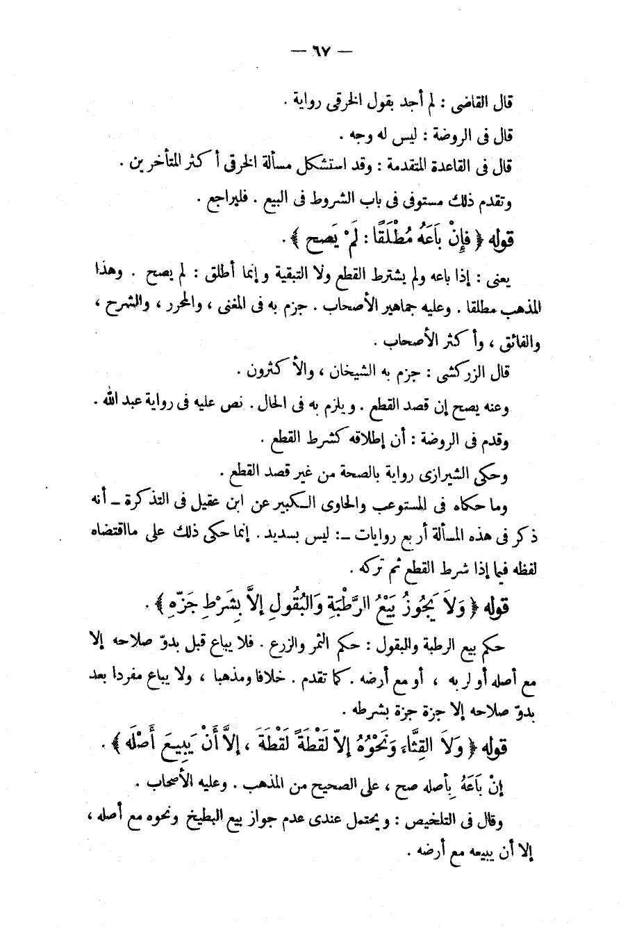 قَالَ الْقَاضِي: لَمْ أَجِدْ بِقَوْلِ الْخِرَقِيِّ رِوَايَةً. قَالَ فِي الرَّوْضَةِ: لَيْسَ لَهُ وَجْهٌ. قَالَ فِي الْقَاعِدَةِ الْمُتَقَدِّمَةِ: وَقَدْ اسْتَشْكَلَ مَسْأَلَةَ الْخِرَقِيِّ أَكْثَرُ الْمُتَأَخِّرِينَ. وَتَقَدَّمَ ذَلِكَ مُسْتَوْفًى فِي بَابِ الشُّرُوطِ فِي الْبَيْعِ. فَلْيُرَاجَعْ قَوْلُهُ (فَإِنْ بَاعَهُ مُطْلَقًا: لَمْ يَصِحَّ) . يَعْنِي: إذَا بَاعَهُ وَلَمْ يَشْتَرِطْ الْقَطْعَ وَلَا التَّبْقِيَةَ وَإِنَّمَا أَطْلَقَ: لَمْ يَصِحَّ. وَهَذَا الْمَذْهَبُ مُطْلَقًا. وَعَلَيْهِ جَمَاهِيرُ الْأَصْحَابِ. جَزَمَ بِهِ فِي الْمُغْنِي، وَالْمُحَرَّرِ، وَالشَّرْحِ، وَالْفَائِقِ، وَأَكْثَرُ الْأَصْحَابِ. قَالَ الزَّرْكَشِيُّ: جَزَمَ بِهِ الشَّيْخَانِ، وَالْأَكْثَرُونَ وَعَنْهُ يَصِحُّ إنْ قَصَدَ الْقَطْعَ. وَيَلْزَمُ بِهِ فِي الْحَالِ. نَصَّ عَلَيْهِ فِي رِوَايَةِ عَبْدِ اللَّهِ. وَقَدَّمَ فِي الرَّوْضَةِ: أَنَّ إطْلَاقَهُ كَشَرْطِ الْقَطْعِ. وَحَكَى الشِّيرَازِيُّ رِوَايَةً بِالصِّحَّةِ مِنْ غَيْرِ قَصْدِ الْقَطْعِ. وَمَا حَكَاهُ فِي الْمُسْتَوْعِبِ وَالْحَاوِي الْكَبِيرِ عَنْ ابْنِ عَقِيلٍ فِي التَّذْكِرَةِ أَنَّهُ ذَكَرَهُ فِي هَذِهِ الْمَسْأَلَةِ أَرْبَعَ رِوَايَاتٍ: لَيْسَ بِسَدِيدٍ. إنَّمَا حَكَى ذَلِكَ عَلَى مَا اقْتَضَاهُ لَفْظُهُ فِيمَا إذَا شَرَطَ الْقَطْعَ ثُمَّ تَرَكَهُ.