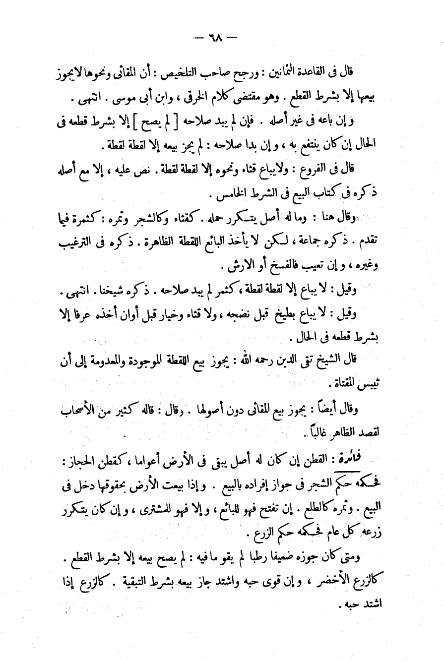 قَالَ فِي الْقَاعِدَةِ الثَّمَانِينَ: وَرَجَّحَ صَاحِبُ التَّلْخِيصِ: أَنَّ الْمَقَاثِيَ وَنَحْوَهَا لَا يَجُوزُ بَيْعُهَا إلَّا بِشَرْطِ الْقَطْعِ. وَهُوَ مُقْتَضَى كَلَامِ الْخِرَقِيِّ وَابْنِ أَبِي مُوسَى. انْتَهَى.