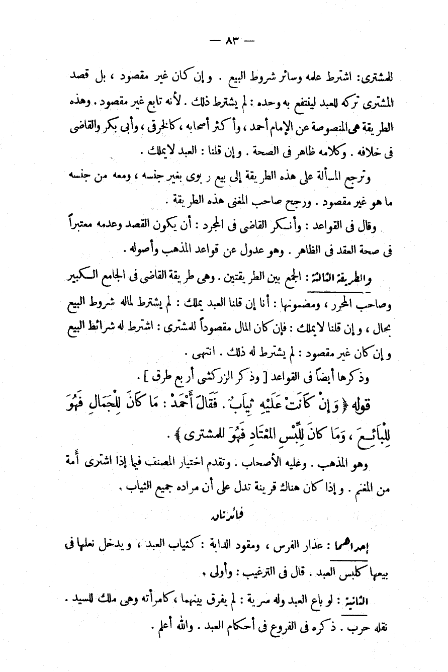 لِلْمُشْتَرِي: اُشْتُرِطَ عِلْمُهُ وَسَائِرُ شُرُوطِ الْبَيْعِ. وَإِنْ كَانَ غَيْرَ مَقْصُودٍ، بَلْ قَصَدَ الْمُشْتَرِي تَرْكَهُ لِلْعَبْدِ لِيَنْتَفِعَ بِهِ وَحْدَهُ: لَمْ يَشْتَرِطْ ذَلِكَ. لِأَنَّهُ تَابِعٌ غَيْرُ مَقْصُودٍ. وَهَذِهِ الطَّرِيقَةُ هِيَ الْمَنْصُوصَةُ عَنْ الْإِمَامِ أَحْمَدَ، وَأَكْثَرُ أَصْحَابِهِ. كَالْخِرَقِيِّ، وَأَبِي بَكْرٍ وَالْقَاضِي فِي خِلَافِهِ، وَكَلَامُهُ ظَاهِرٌ فِي الصِّحَّةِ. وَإِنْ قُلْنَا الْعَبْدُ لَا يَمْلِكُ. وَتَرْجِعُ الْمَسْأَلَةُ عَلَى هَذِهِ الطَّرِيقَةِ إلَى بَيْعٍ رِبَوِيٍّ بِغَيْرِ جِنْسِهِ، وَمَعَهُ مِنْ جِنْسِهِ مَا هُوَ غَيْرُ مَقْصُودٍ. وَرَجَّحَ صَاحِبُ الْمُغْنِي هَذِهِ الطَّرِيقَةَ. وَقَالَ فِي الْقَوَاعِدِ: وَأَنْكَرَ الْقَاضِي فِي الْمُجَرَّدِ: أَنْ يَكُونَ الْقَصْدُ وَعَدَمُهُ مُعْتَبَرًا فِي صِحَّةِ الْعَقْدِ فِي الظَّاهِرِ. وَهُوَ عُدُولٌ عَنْ قَوَاعِدِ الْمَذْهَبِ وَأُصُولِهِ. وَالطَّرِيقَةُ الثَّالِثَةُ: الْجَمْعُ بَيْنَ الطَّرِيقَتَيْنِ وَهِيَ طَرِيقَةُ الْقَاضِي فِي الْجَامِعِ الْكَبِيرِ وَصَاحِبِ الْمُحَرَّرِ، وَمَضْمُونُهَا: أَنَّا إنْ قُلْنَا الْعَبْدُ يَمْلِكُ: لَمْ يُشْتَرَطْ لِمَالِهِ شُرُوطُ الْبَيْعِ بِحَالٍ، وَإِنْ قُلْنَا: لَا يَمْلِكُ: فَإِنْ كَانَ الْمَالُ مَقْصُودًا لِلْمُشْتَرِي: اُشْتُرِطَ لَهُ شَرَائِطُ الْبَيْعِ وَإِنْ كَانَ غَيْرَ مَقْصُودٍ: لَمْ يُشْتَرَطْ لَهُ ذَلِكَ. انْتَهَى.