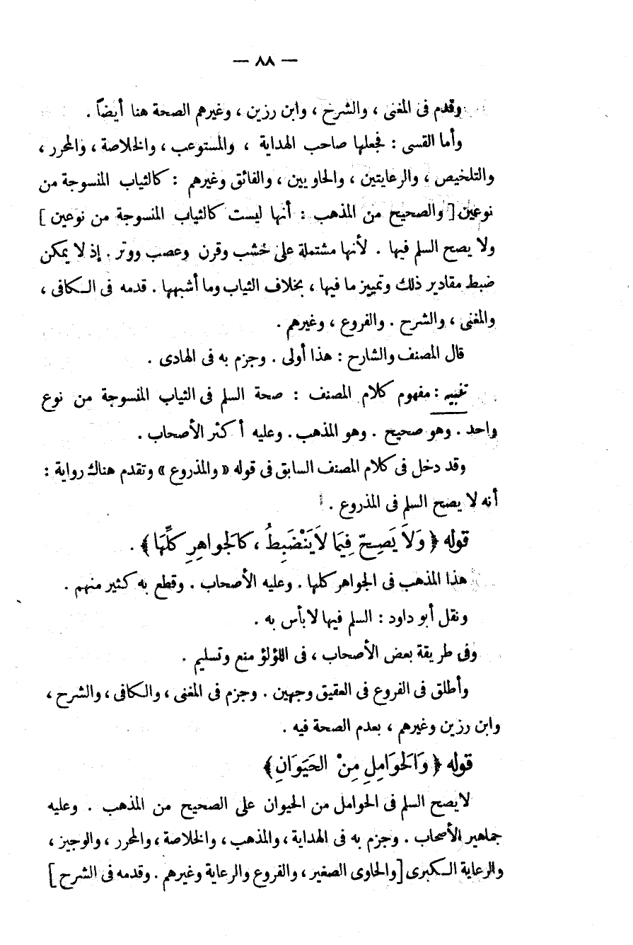 وَقَدَّمَ فِي الْمُغْنِي، وَالشَّرْحِ، وَابْنِ رَزِينٍ، وَغَيْرِهِمْ الصِّحَّةُ هُنَا أَيْضًا. وَأَمَّا الْقَسِّيُّ: فَجَعَلَهَا صَاحِبُ الْهِدَايَةِ، وَالْمُسْتَوْعِبِ، وَالْخُلَاصَةِ، وَالْمُحَرَّرِ، وَالتَّلْخِيصِ، وَالرِّعَايَتَيْنِ، وَالْحَاوِيَيْنِ، وَالْفَائِقِ وَغَيْرِهِمْ: كَالثِّيَابِ الْمَنْسُوجَةِ مِنْ نَوْعَيْنِ [وَالصَّحِيحُ مِنْ الْمَذْهَبِ: أَنَّهَا لَيْسَتْ كَالثِّيَابِ الْمَنْسُوجَةِ مِنْ نَوْعَيْنِ] وَلَا يَصِحُّ السَّلَمُ فِيهَا. لِأَنَّهَا مُشْتَمِلَةٌ عَلَى خَشَبٍ وَقَرْنٍ وَعَصَبٍ وَوِتْرٍ. إذْ لَا يُمْكِنُ ضَبْطُ مَقَادِيرِ ذَلِكَ وَتَمْيِيزُ مَا فِيهَا، بِخِلَافِ الثِّيَابِ وَمَا أَشْبَهَهَا. قَدَّمَهُ فِي الْكَافِي، وَالْمُغْنِي، وَالشَّرْحِ. وَالْفُرُوعِ، وَغَيْرِهِمْ. قَالَ الْمُصَنِّفُ وَالشَّارِحُ: هَذَا أَوْلَى. وَجَزَمَ بِهِ فِي الْهَادِي.