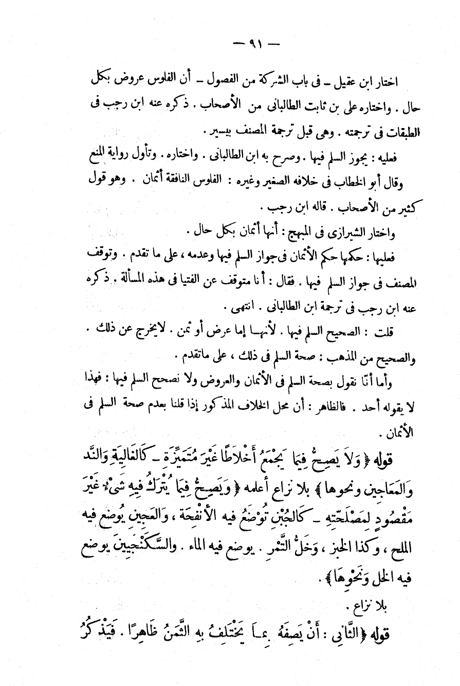 اخْتَارَ ابْنُ عَقِيلٍ فِي بَابِ الشَّرِكَةِ مِنْ الْفُصُولِ أَنَّ الْفُلُوسَ عُرُوضٌ بِكُلِّ حَالٍ. وَاخْتَارَهُ عَلِيُّ بْنُ ثَابِتٍ الطَّالِبَانِيُّ مِنْ الْأَصْحَابِ. ذَكَرَهُ عَنْهُ ابْنُ رَجَبٍ فِي الطَّبَقَاتِ فِي تَرْجَمَتِهِ. وَهِيَ قَبْلَ تَرْجَمَةِ الْمُصَنِّفِ بِيَسِيرٍ. فَعَلَيْهِ: يَجُوزُ السَّلَمُ فِيهَا. وَصَرَّحَ بِهِ ابْنُ الطَّالِبَانِيِّ. وَاخْتَارَهُ. وَتَأَوَّلَ رِوَايَةَ الْمَنْعِ وَقَالَ أَبُو الْخَطَّابِ فِي خِلَافِهِ الصَّغِيرِ وَغَيْرُهُ: الْفُلُوسُ النَّافِقَةُ أَثْمَانٌ. وَهُوَ قَوْلُ كَثِيرٍ مِنْ الْأَصْحَابِ. قَالَهُ ابْنُ رَجَبٍ. وَاخْتَارَ الشِّيرَازِيُّ فِي الْمُبْهِجِ: أَنَّهَا أَثْمَانٌ بِكُلِّ حَالٍ. فَعَلَيْهَا: حُكْمُهَا حُكْمُ الْأَثْمَانِ فِي جَوَازِ السَّلَمِ فِيهَا وَعَدَمِهِ، عَلَى مَا تَقَدَّمَ. وَتَوَقَّفَ الْمُصَنِّفُ فِي جَوَازِ السَّلَمِ فِيهَا. فَقَالَ: أَنَا مُتَوَقِّفٌ عَنْ الْفُتْيَا فِي هَذِهِ الْمَسْأَلَةِ. ذَكَرَهُ عَنْهُ ابْنُ رَجَبٍ فِي تَرْجَمَةِ ابْنِ الطَّالِبَانِيِّ. انْتَهَى.