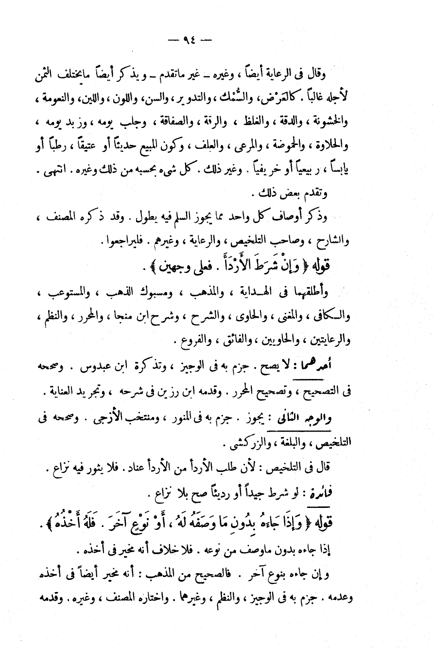 وَقَالَ فِي الرِّعَايَةِ: أَيْضًا، وَغَيْرُهُ غَيْرُ مَا تَقَدَّمَ وَيَذْكُرُ أَيْضًا مَا يَخْتَلِفُ الثَّمَنُ لِأَجْلِهِ غَالِبًا. كَالْعَرْضِ، وَالسُّمْكِ، وَالتَّدْوِيرِ، وَالسِّنِّ، وَاللَّوْنِ، وَاللِّينِ، وَالنُّعُومَةِ، وَالْخُشُونَةِ، وَالدِّقَّةِ، وَالْغِلَظِ، وَالرِّقَّةِ، وَالصَّفَاقَةِ، وَجَلْبِ يَوْمِهِ، وَزُبْدِ يَوْمِهِ، وَالْحَلَاوَةِ، وَالْحُمُوضَةِ، وَالْمَرْعَى، وَالْعَلَفِ، وَكَوْنِ الْمَبِيعِ حَدِيثًا أَوْ عَتِيقًا، رَطْبًا أَوْ يَابِسًا، رَبِيعِيًّا أَوْ خَرِيفِيًّا. وَغَيْرِ ذَلِكَ. كُلُّ شَيْءٍ بِحَسْبِهِ مِنْ ذَلِكَ وَغَيْرِهِ. انْتَهَى.
