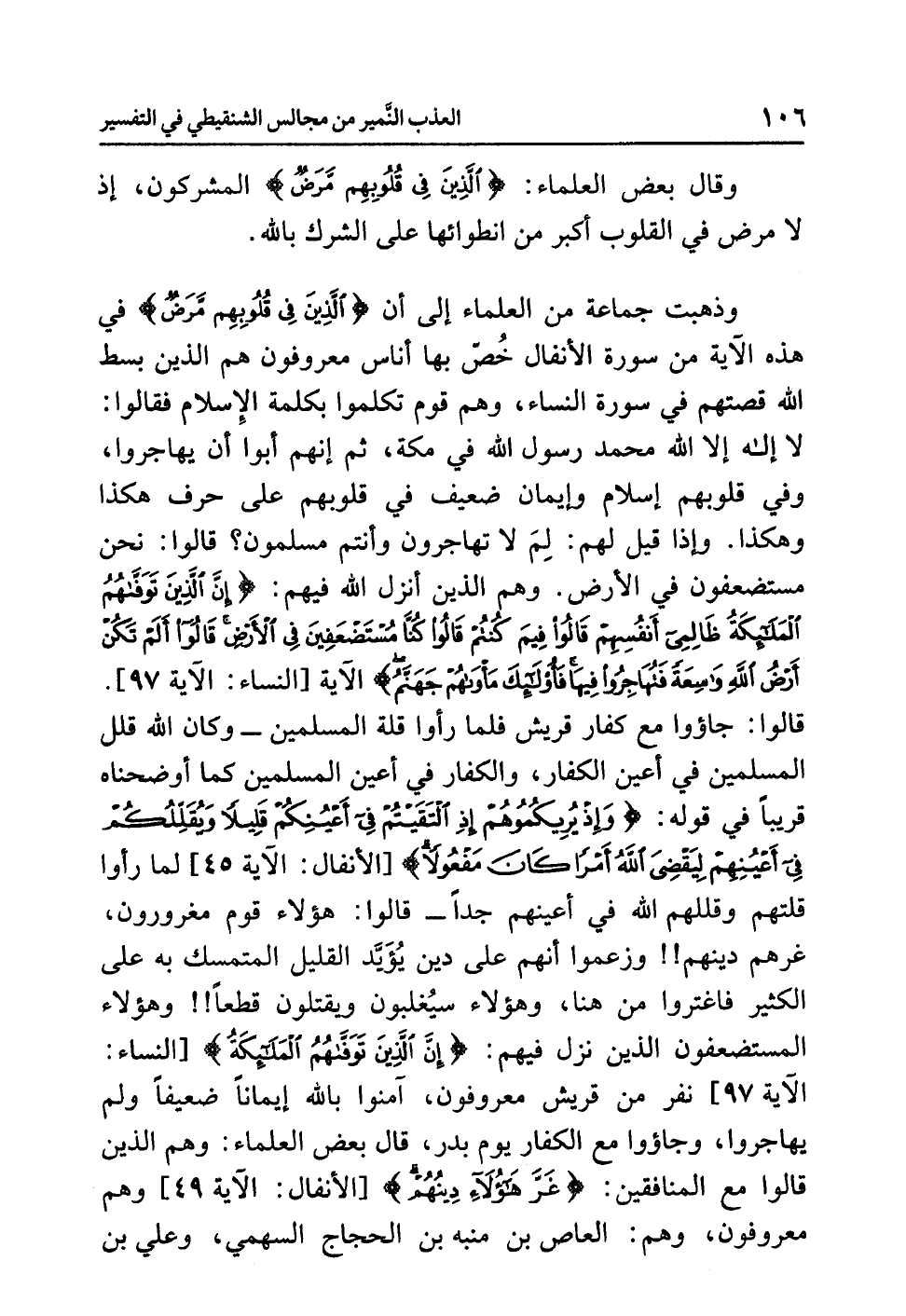 وذهبت جماعة من العلماء إلى أن {الَّذِينَ فِي قُلُوبِهِم مَّرَضٌ} في هذه الآية من سورة الأنفال خُصَّ بها أناس معروفون هم الذين بسط الله قصتهم في سورة النساء، وهم قوم تكلموا بكلمة الإسلام فقالوا: لا إله إلا الله محمد رَسُول الله في مكة، ثم إنهم أبوا أن يهاجروا، وفي قلوبهم إسلام وإيمان ضعيف في قلوبهم على حرف هكذا وهكذا. وإذا قيل لهم: لِمَ لا تهاجرون وأنتم مسلمون؟ قالوا: نحن مستضعفون في الأرض. وهم الذين أنزل الله فيهم: {إِنَّ الَّذِينَ تَوَفَّاهُمُ الْمَلآئِكَةُ ظَالِمِي أَنْفُسِهِمْ قَالُواْ فِيمَ كُنتُمْ قَالُواْ كُنَّا مُسْتَضْعَفِينَ فِي الأَرْضِ قَالْوَاْ أَلَمْ تَكُنْ أَرْضُ اللَّهِ وَاسِعَةً فَتُهَاجِرُواْ فِيهَا فَأُوْلَئِكَ مَأْوَاهُمْ جَهَنَّمُ} الآية [النساء: الآية 97].