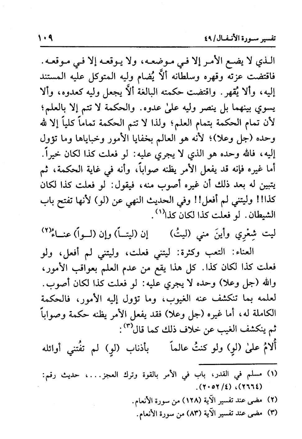الذي لا يضع الأمر إلا في موضعه، ولا يوقعه إلا في موقعه. فاقتضت عزته وقهره وسلطانه ألاّ يُضام وليه المتوكل عليه المستند إليه، وألا يُقهر. واقتضت حكمته البالغة ألاّ يجعل وليه كعدوه، وألا يسوي بينهما بل ينصر وليه على عدوه. والحكمة لا تتم إلا بالعلم؛ لأن تمام الحكمة بتمام العلم؛ ولذا لا تتم الحكمة تماماً كليّاً إلا لله وحده (جل وعلا)؛ لأنه هو العالم بخفايا الأُمور وخباياها وما تؤول إليه، فالله وحده هو الذي لا يجري عليه: لو فعلت كذا لكان خيراً. أما غيره فإنه قد يفعل الأمر يظنه صواباً، وأنه في غاية الحكمة، ثم يتبين له بعد ذلك أن غيره أصوب منه، فيقول: لو فعلت كذا لكان كذا!! وليتني لم أفعل!! وفي الحديث النهي عن (لو) لأنها تفتح باب الشيطان. لو فعلت كذا لكان كذا (¬1).
