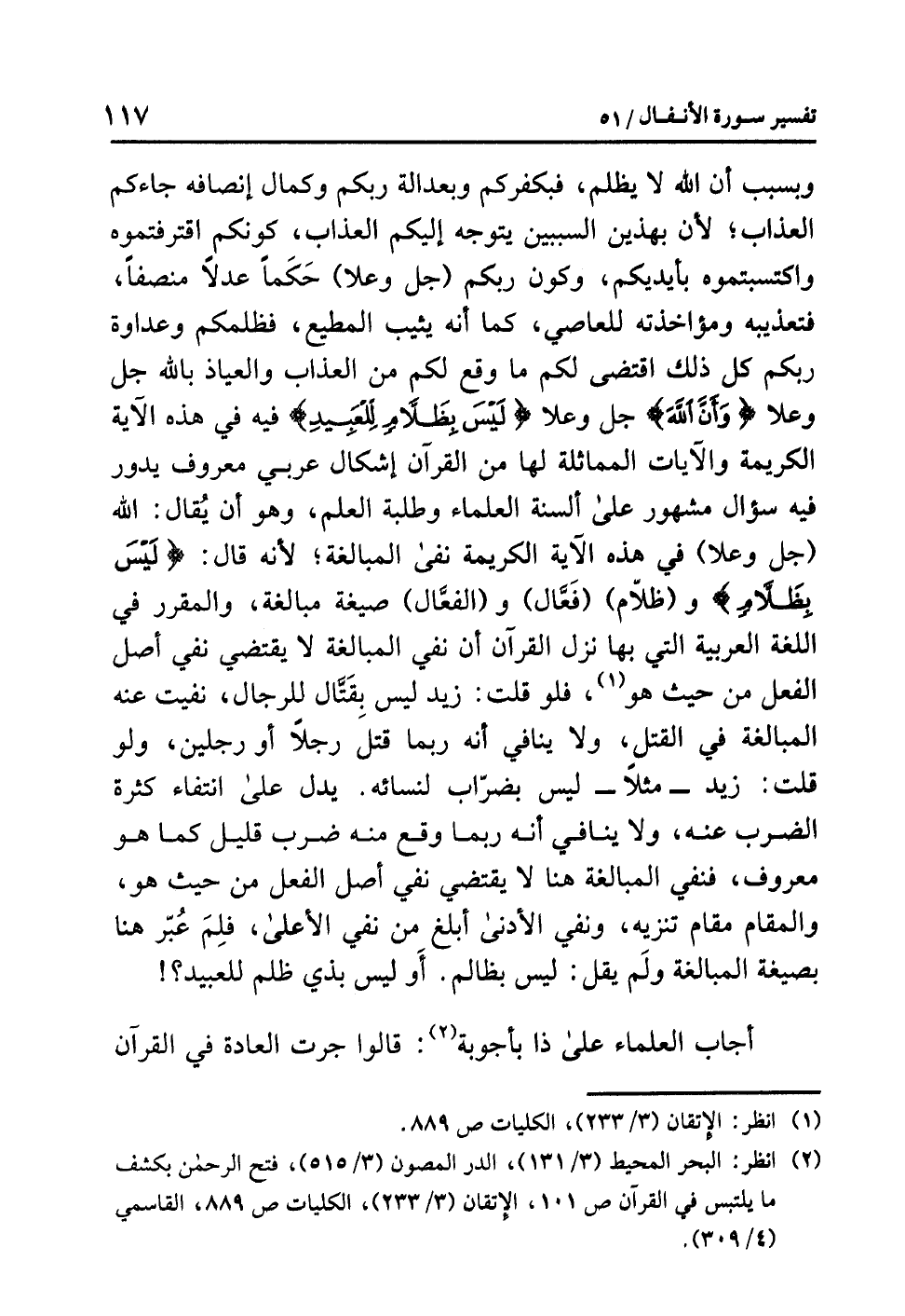 وبسبب أن الله لا يَظْلِم، فبِكُفْرِكُمْ وبِعَدَالَةِ رَبِّكُمْ وكَمَالِ إِنْصَافِهِ جاءكم العذاب؛ لأن بهذين السببين يتوجه إليكم العذاب، كونكم اقترفتموه واكْتَسَبْتُمُوهُ بأيديكم، وكون ربكم (جل وعلا) حكماً عدلاً منصفاً، فتعذيبه ومؤاخذته للعاصي، كما أنه يثيب المطيع، فظلمكم وعداوة ربكم كل ذلك اقتضى لكم ما وقع لكم من العذاب والعياذ بالله جل وعلا {وَأَنَّ اللَّهَ} جل وعلا {لَيْسَ بِظَلاَّمٍ لِّلْعَبِيدِ} فيه في هذه الآية الكريمة والآيات المماثلة لها من القرآن إشكال عربي معروف يدور فيه سؤال مشهور على ألسنة العلماء وطلبة العلم، وهو أن يُقال: الله (جل وعلا) في هذه الآية الكريمة نفى المبالغة؛ لأنه قال: {لَيْسَ بِظَلاَّمٍ} و (ظلاّم) (فَعَّال) و (الفعَّال) صيغة مبالغة، والمقرر في اللغة العربية التي بها نزل القرآن أن نفي المبالغة لا يقتضي نفي أَصْلِ الفِعْلِ من حيث هو (¬1)، فلو قلت: زيد ليس بقَتَّال للرجال، نفيت عنه المبالغة في القتل، ولا ينافي أنه ربما قتل رجلاً أو رجلين، ولو قلت: زيد -مثلاً- ليس بضرّاب لنسائه. يدل على انتفاء كثرة الضرب عنه، ولا ينافي أنه ربما وقع منه ضرب قليل كما هو معروف، فنفي المبالغة هنا لا يقتضي نفي أصل الفعل من حيث هو، والمقام مقام تنْزِيه، ونفي الأدنى أبلغ مِنْ نَفْيِ الأَعْلَى، فلِمَ عُبّر هنا بصيغة المبالغة ولَم يقل: ليس بظالم. أَو ليس بذي ظلم للعبيد؟!