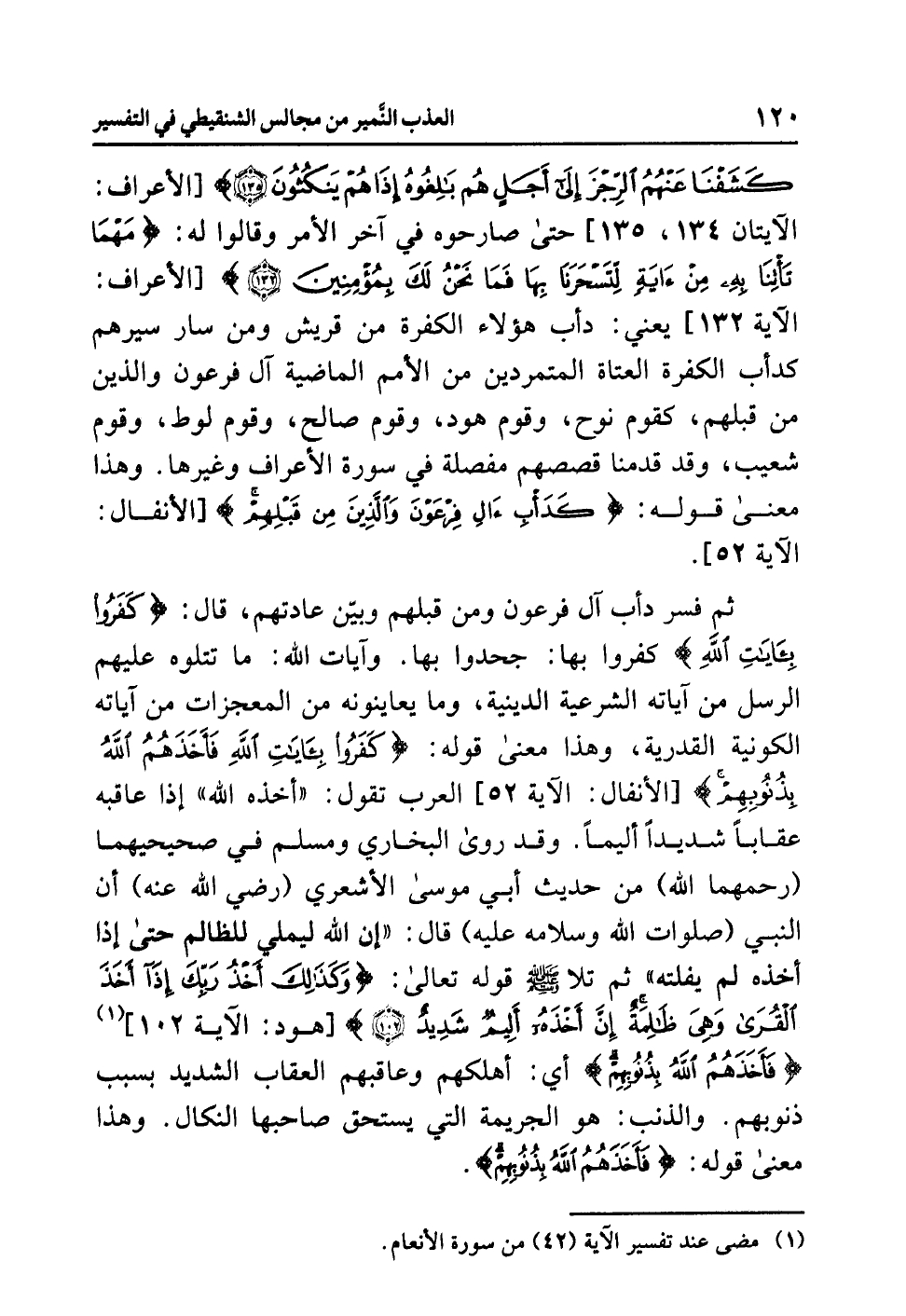 كَشَفْنَا عَنْهُمُ الرِّجْزَ إِلَى أَجَلٍ هُم بَالِغُوهُ إِذَا هُمْ يَنكُثُونَ (135)} [الأعراف: الآيتان 134، 135] حتى صارحوه في آخر الأمر وقالوا له: {مَهْمَا تَأْتِنَا بِهِ مِن آيَةٍ لِّتَسْحَرَنَا بِهَا فَمَا نَحْنُ لَكَ بِمُؤْمِنِينَ} [الأعراف: الآية 132] يعني: دأب هؤلاء الكفرة من قريش ومن سار سيرهم كدأب الكفرة العتاة المتمرِّدين من الأمم الماضية آل فرعون والذين من قبلهم، كقوم نوح، وقوم هود، وقوم صالح، وقوم لوط، وقوم شعيب، وقد قدمنا قصصهم مفصلة في سورة الأعراف وغيرها، وهذا معنى قوله: {كَدَأْبِ آلِ فِرْعَوْنَ وَالَّذِينَ مِن قَبْلِهِمْ} [الأنفال: الآية 52].