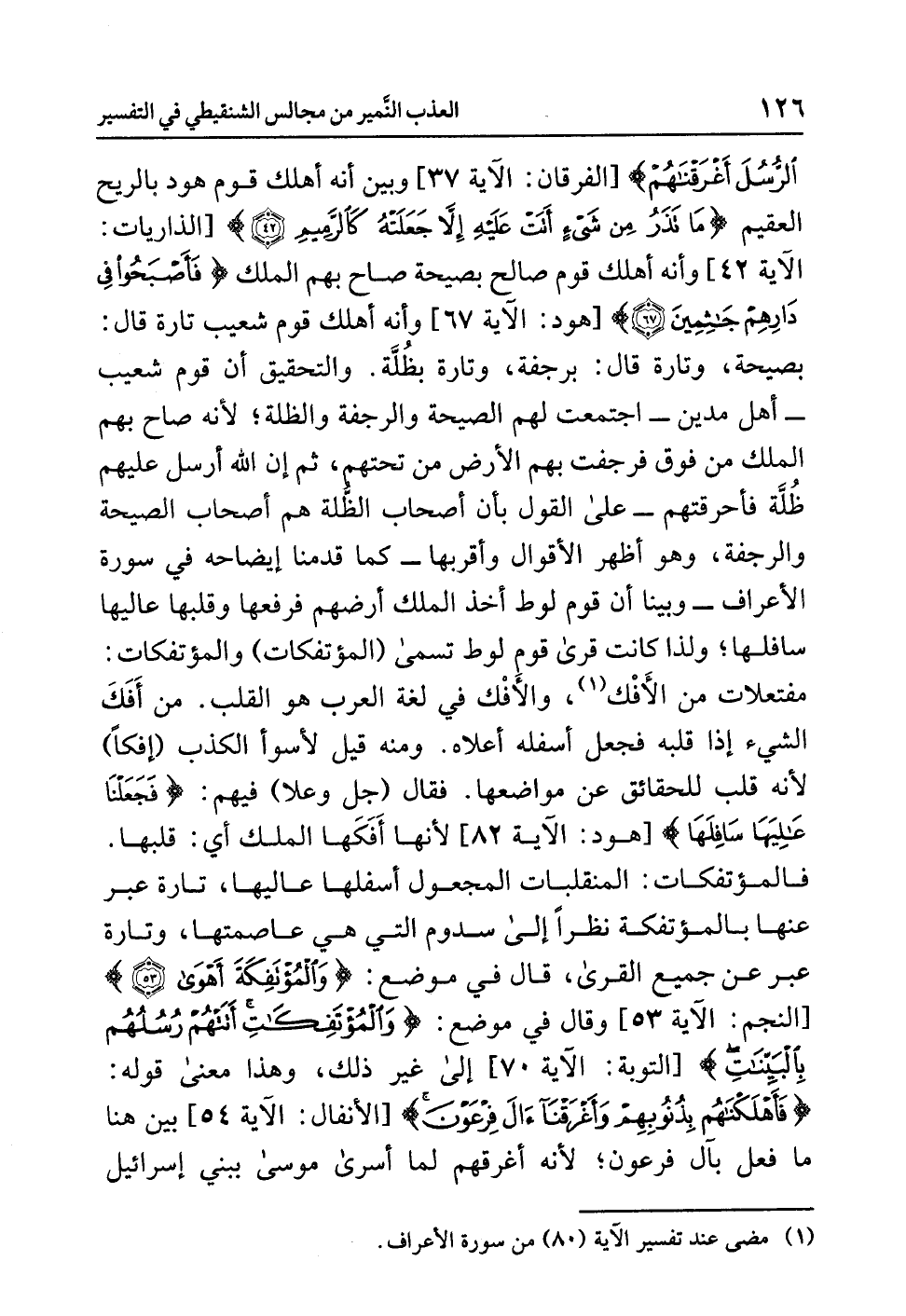 الرُّسُلَ أَغْرَقْنَاهُمْ} [الفرقان: الآية 37] وبين أنه أهلك قوم هود بالريح العقيم {مَا تَذَرُ مِن شَيْءٍ أَتَتْ عَلَيْهِ إِلاَّ جَعَلَتْهُ كَالرَّمِيمِ (42)} [الذاريات: الآية 42] وأنه أهلك قوم صالح بصيحة صاح بهم الملك {فَأَصْبَحُواْ فِي دِيَارِهِمْ جَاثِمِينَ} [هود: الآية 67] وأنه أهلك قوم شعيب تارة قال: بصيحة، وتارة قال: برجفة، وتارة بظُلَّة. والتحقيق أن قوم شعيب -أهل مدين- اجتمعت لهم الصيحة والرجفة والظلة؛ لأنه صاح بهم الملك من فوق فرجفت بهم الأرض مِنْ تَحْتِهِمْ، ثم إن الله أرسل عليهم ظُلَّّة فأحرقتهم - على القول بأن أصحاب الظُّلة هم أصحاب الصيحة والرجفة، وهو أظهر الأقوال وأقربها -كما قدمنا إيضاحه في سورة الأعراف- وبينا أن قوم لوط أخذ المَلَكُ أرْضَهُمْ فَرَفَعَها وقَلَبَهَا عَالِيَهَا سافلها؛ ولذا كانت قرى قوم لوط تسمى (المؤتفكات) والمؤتفكات: مفْتعلات من الأَفْك (¬1)، والأَفْك في لغة العرب هو القلب. من أفَكَ الشَّيْءَ: إذا قَلَبَهُ فجعل أسْفَلَهُ أعْلاَهُ. ومنه قيل لأسوأ الكذب (إفكاً) لأنه قلب للحقائق عن مواضعها. فقال (جل وعلا) فيهم: {فَجَعَلْنَا عَالِيَهَا سَافِلَهَا} [هود: الآية 82] لأنها أَفَكَها الملك أي: قلبها.