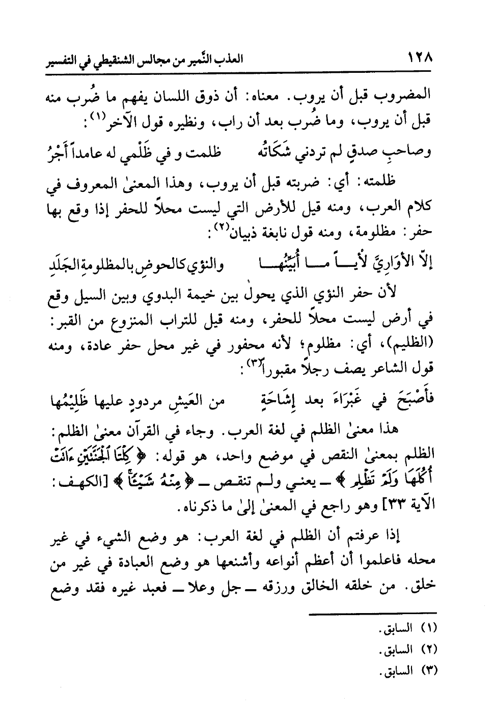 هذا معنى الظلم في لغة العرب. وجاء في القرآن معنى الظلم: الظلم بمعنى النقص في موضع واحد، هو قوله: {كِلْتَا الْجَنَّتَيْنِءَاتَتْ أُكُلَهَا وَلَمْ تَظْلِمْ} -يعني ولم تنقص- {مِنْهُ شَيْئاً} [الكهف: الآية 33] وهو راجع في المعنى إلى ما ذكرناه.