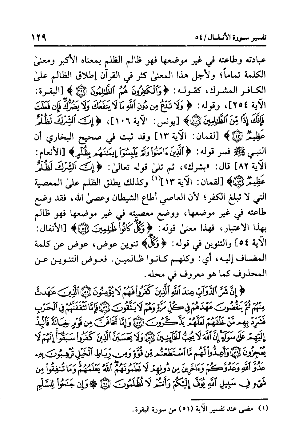 عِبَادَتَهُ وطاعته في غير موضعها فهو ظالم الظلم بمعناه الأكبر ومعنى الكلمة تمامًا؛ ولأجْلِ هَذَا المعْنَى كثر في القرآن إطلاق الظالم على الكافر المشرك، كقوله: {وَالْكَافِرُونَ هُمُ الظَّالِمُونَ} [البقرة: الآية 254] وقوله: {وَلاَ تَدْعُ مِن دُونِ اللَّهِ مَا لاَ يَنفَعُكَ وَلاَ يَضُرُّكَ فَإِن فَعَلْتَ فَإِنَّكَ إِذاً مِّنَ الظَّالِمِينَ} [يونس: الآية 106] {إِنَّ الشِّرْكَ لَظُلْمٌ عَظِيمٌ} [لقمان: الآية 13] وقد ثبت في صحيح البخاري أن النبي صلى الله عليه وسلم فسر قوله: {الَّذِينَ آمَنُواْ وَلَمْ يَلْبِسُواْ إِيمَانَهُم بِظُلْمٍ} [الأنعام: الآية 82] قال: «بشرك»، ثم تلا قوله تعالى: {إِنَّ الشِّرْكَ لَظُلْمٌ عَظِيمٌ} [لقمان: الآية 13] (¬1) وكذلك يطلق الظلم على المعصية التي لا تبلغ الكفر؛ لأن العاصي أطاع الشيطان وعصى الله، فقد وضع طاعته في غير موضعها، ووضع معصيته في غير موضعها فهو ظالم بهذا الاعتبار، فهذا معنى قوله: {وَكُلٌّ كَانُواْ ظَالِمِينَ} [الأنفال: الآية 54] والتنوين في قوله: {وَكُلٌّ} تنوين عوض، عوض عن كلمة المضاف إليه، أي: وكلهم كانوا ظالمين. فعوض التنوين عن المحذوف كما هو معروف في محله.