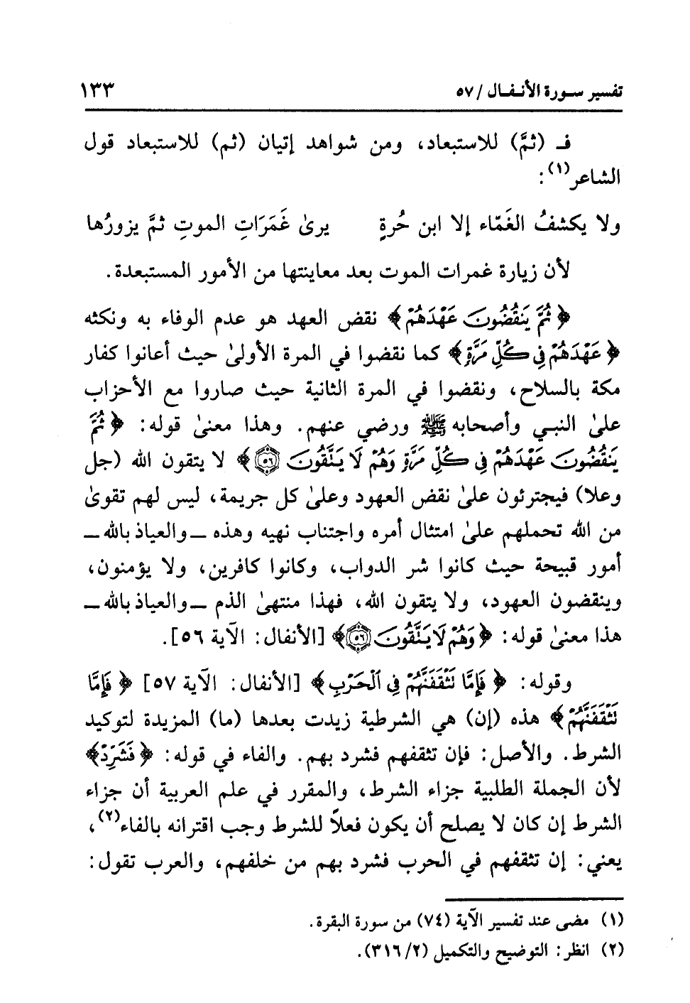 وقوله: {فَإِمَّا تَثْقَفَنَّهُمْ فِي الْحَرْبِ} [الأنفال: الآية 57] {فَإِمَّا تَثْقَفَنَّهُمْ} هذه (إن) هي الشرطية زيدت بعدها (ما) المزيدة لتوكيد الشرط. والأصل: فإن تثقفهم فشرد بهم. والفاء في قوله: {فَشَرِّدْ} لأن الجملة الطلبية جزاء الشرط، والمقرر في علم العربية أن جزاء الشرط إن كان لا يصلح أن يكون فعلاً للشرط وجب اقترانه بالفاء (¬2)، يعني: إن تثقفهم في الحرب فشرد بهم من خلفهم، والعرب تقول: