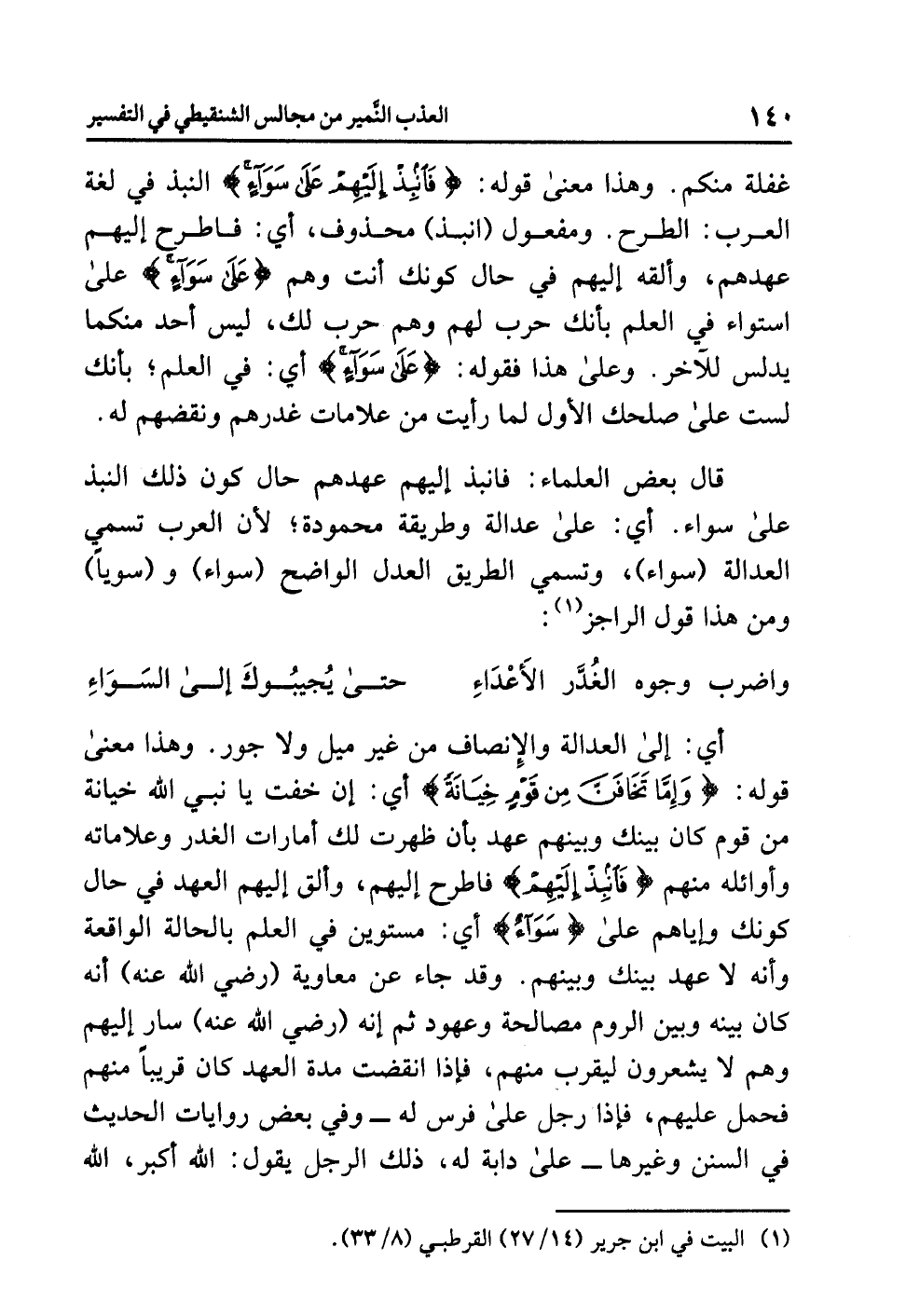 قال بعض العلماء: فانبذ إليهم عَهْدَهُم حَالَ كَوْنِ ذلك النبذ على سواء. أي: على عدالة وطريقة محمودة؛ لأن العرب تسمي العَدَالَةَ (سواء)، وتسمي الطريق العدل الواضح (سواء) و (سويّاً) ومن هذا قول الراجز (¬1):