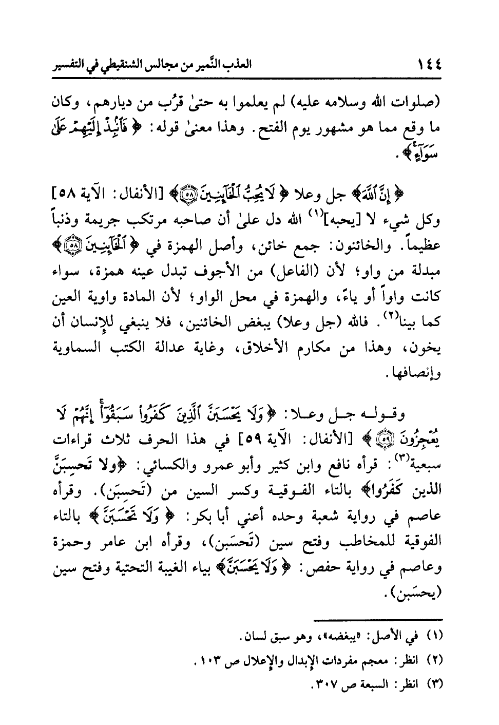 {إِنَّ اللَّهَ} جل وعلا {لاَ يُحِبُّ الخَائِنِينَ} [الأنفال: الآية 58] وكل شيء لا [يحبه] (¬1) الله دل على أن صاحبه مرتكب جريمة وذنباً عظيماً. والخائنون: جمع خائن، وأصل الهمزة في {الخَائِنِينَ} مبدلة من واو؛ لأن (الفاعل) من الأجوف تبدل عينه همزة، سواء كانت واواً أو ياءً، والهمزة في محل الواو؛ لأن المادة واوية العين كما بينا (¬2). فالله (جل وعلا) يبغض الخائنين، فلا ينبغي للإنسان أن يخون، وهذا مِنْ مَكَارِمِ الأخلاق، وغاية عدالة الكتب السماوية وإنصافها.