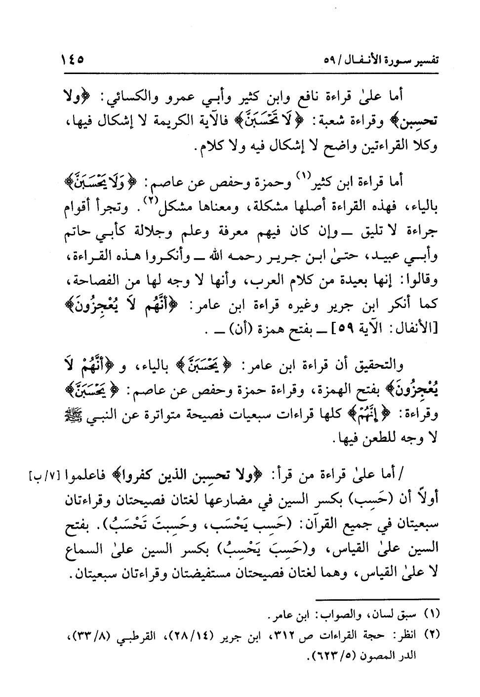 والتحقيق أن قراءة ابن عامر: {يَحْسَبَنَّ} بالياء، و {أنَّهُمْ لاَ يُعْجِزُونَ} بفتح الهمزة، وقراءة حمزة وحفص عن عاصم: {يَحْسَبَنَّ} وقراءة: {إِنَّهُمْ} كلها قراءات سبعيات فصيحة متواترة عن النبي صلى الله عليه وسلم لا وَجْهَ لِلطَّعْنِ فيها.