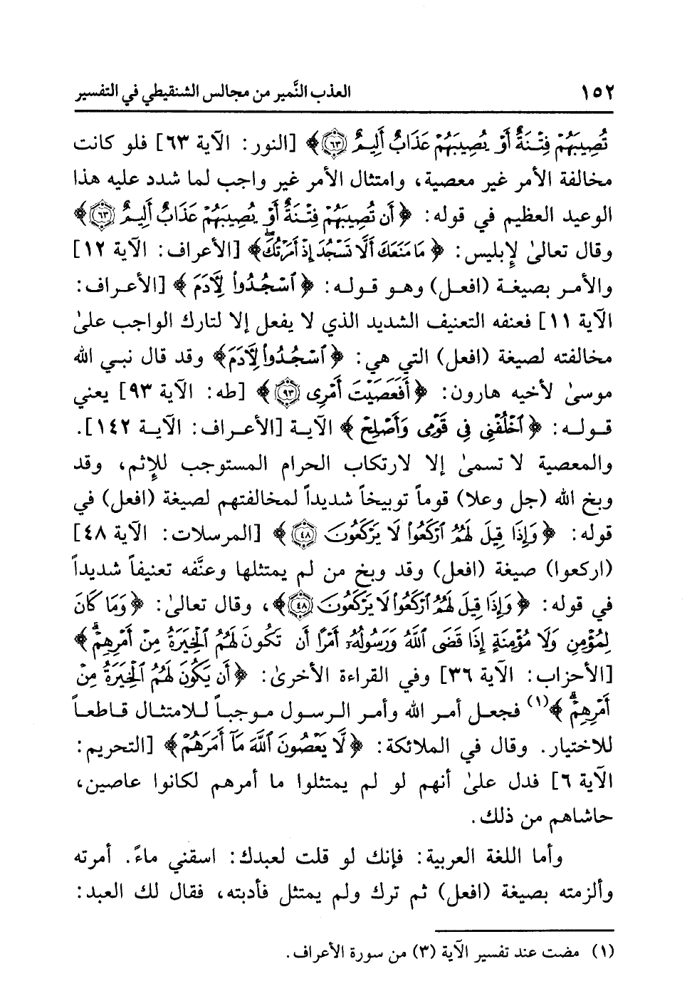 تُصِيبَهُمْ فِتْنَةٌ أَوْ يُصِيبَهُمْ عَذَابٌ أَلِيمٌ} [النور: الآية 63] فلو كانت مخالفة الأمر غير معصية، وامتثال الأمر غير واجب لما شدد عليه هذا الوعيد العظيم في قوله: {أَن تُصِيبَهُمْ فِتْنَةٌ أَوْ يُصِيبَهُمْ عَذَابٌ أَلِيمٌ} وقال تعالى لإبليس: {مَا مَنَعَكَ أَلاَّ تَسْجُدَ إِذْ أَمَرْتُكَ} [الأعراف: الآية 12] والأمر بصيغة (افعل) وهو قوله: {اسْجُدُواْ لآدَمَ} [الأعراف: الآية 11] فعنفه التعنيف الشديد الذي لا يفعل إلا لتارك الواجب على مخالفته لصيغة (افعل) التي هي: {اسْجُدُواْ لآدَمَ} وقد قال نبي الله موسى لأخيه هارون: {أَفَعَصَيْتَ أَمْرِي} [طه: الآية 93] يعني قوله: {اخْلُفْنِي فِي قَوْمِي وَأَصْلِحْ} الآية [الأعراف: الآية 142] والمعصية لا تسمى إلا لارتكاب الحرام المستوجب للإثم، وقد وبخ الله (جل وعلا) قوماً توبيخاً شديداً لمخالفتهم لصيغة (افعل) في قوله: {وَإِذَا قِيلَ لَهُمُ ارْكَعُوا لاَ يَرْكَعُونَ} [المرسلات: الآية 48] (اركعوا) صيغة (افعل) وقد وَبَّخَ مَنْ لم يَمْتَثِلْها وعنّفه تعنيفاً شديداً في قوله: {وَإِذَا قِيلَ لَهُمُ ارْكَعُوا لاَ يَرْكَعُونَ (48)}، وقال تعالى: {وَمَا كَانَ لِمُؤْمِنٍ وَلاَ مُؤْمِنَةٍ إِذَا قَضَى اللَّهُ وَرَسُولُهُ أَمْراً أَن تَكُونَ لَهُمُ الْخِيَرَةُ مِنْ أَمْرِهِمْ} [الأحزاب: الآية 36] وفي القراءة الأخرى: {أَن يَكُونَ لَهُمُ الْخِيَرَةُ مِنْ أَمْرِهِمْ} (¬1) فجعل أمر الله وأمر الرسول موجباً للامتثال قاطعاً للاختيار. وقال في الملائكة: {لاَ يَعْصُونَ اللَّهَ مَا أَمَرَهُمْ} [التحريم: الآية 6] فدل على أنهم لو لم يمتثلوا ما أمرهم لكانوا عاصين، حاشاهم من ذلك.